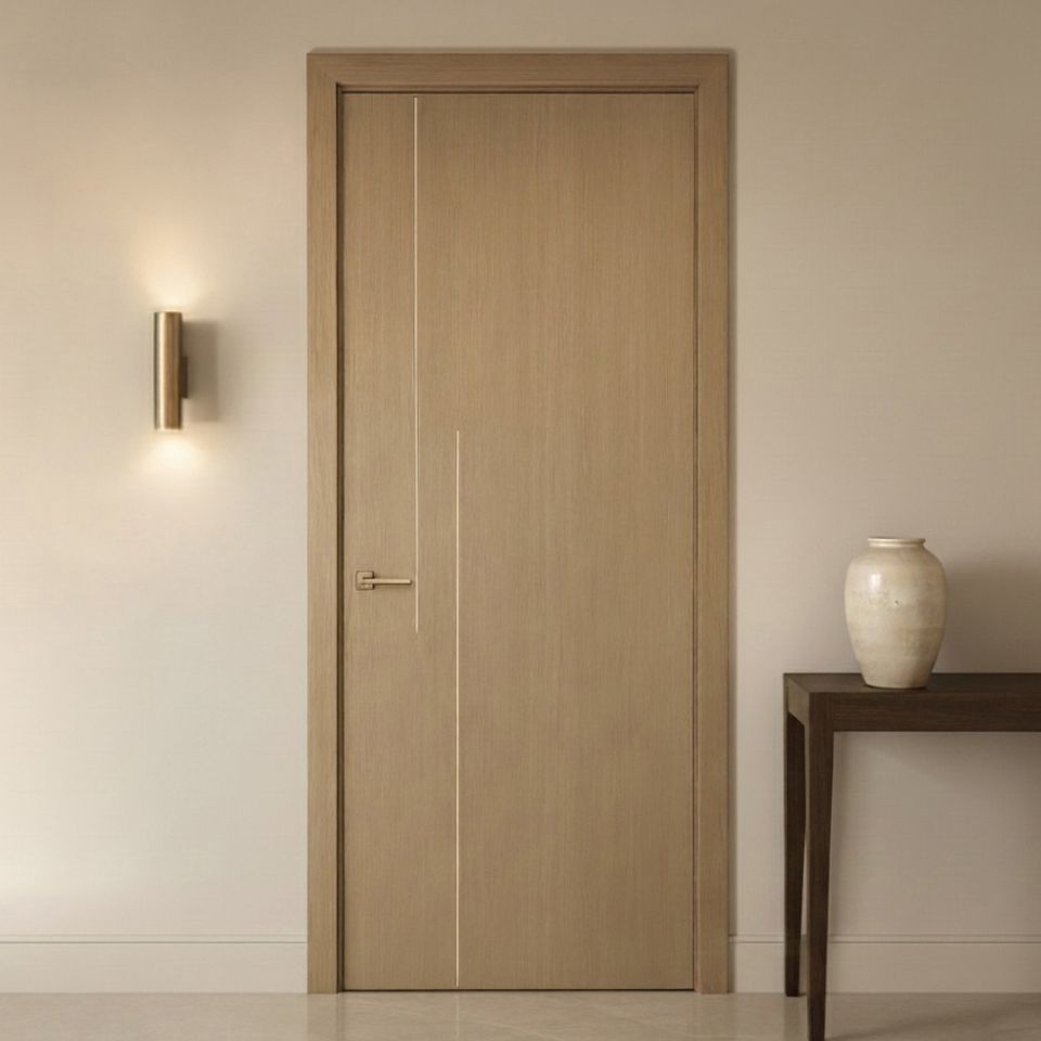 ประตูภายในบ้าน/อพาร์ทเมนท์/โรงแรม วัสดุไม้ปิดผิว PVC กันน้ำ แบบ OEM/ODM วีเนียร์ไม้เคลือบ PVC โครงสร้าง MDF ดีไซน์ทันสมัย พร้อมฉนวนกันเสียง