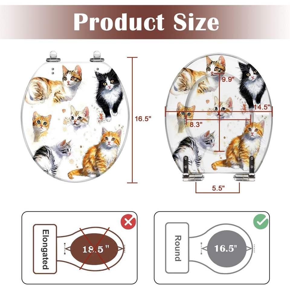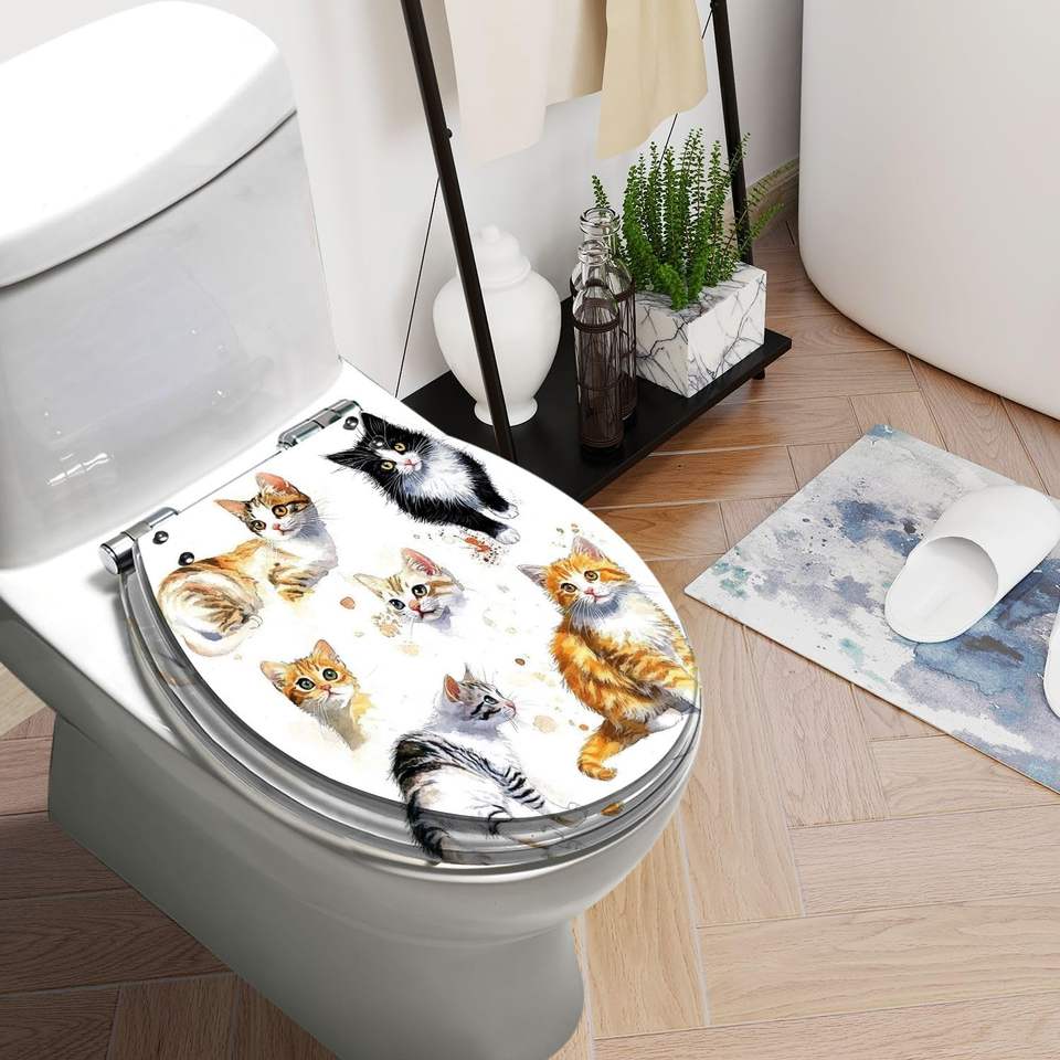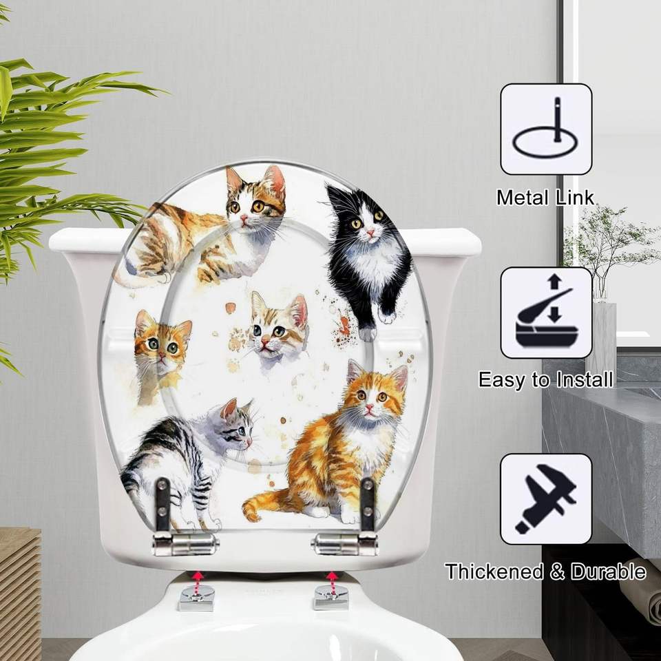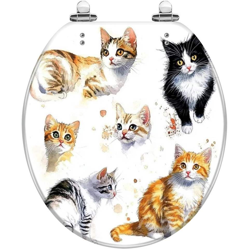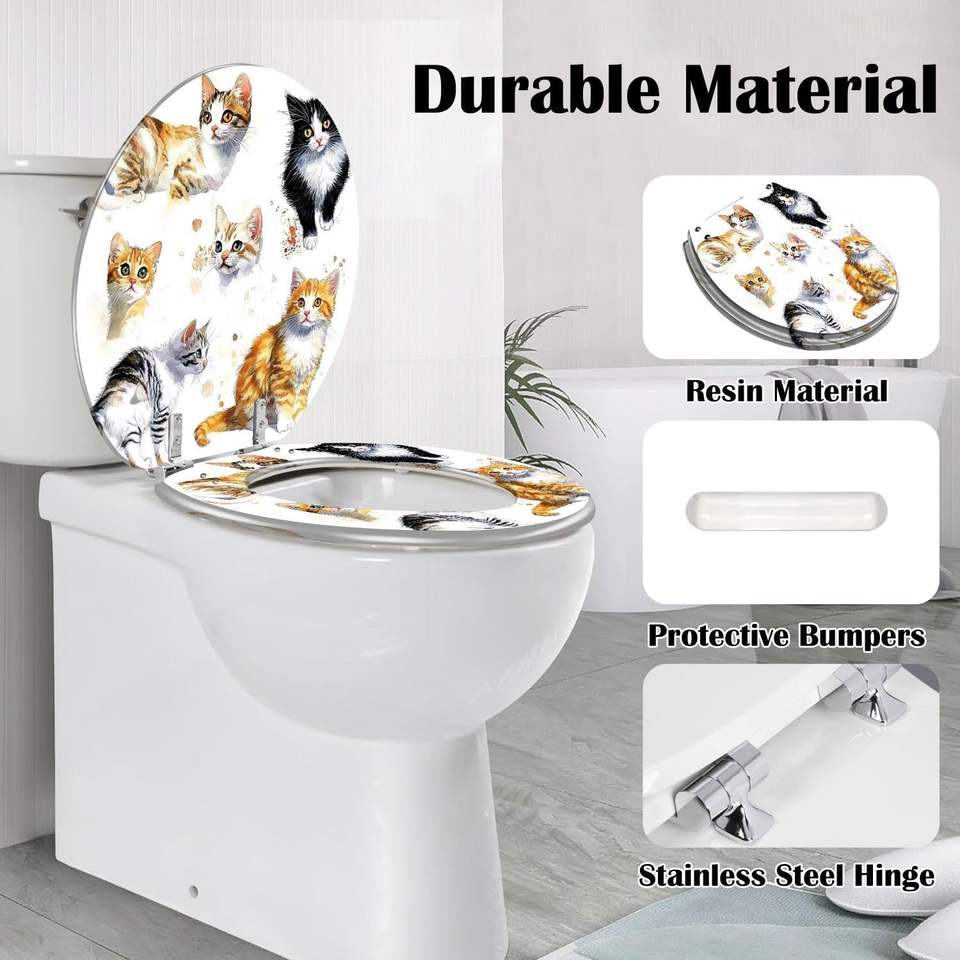 Watercolor Cute Cats Collection Isolated White Resin Toilet Seat Round Elongated Slow Quiet Close with Pedigreed Cats