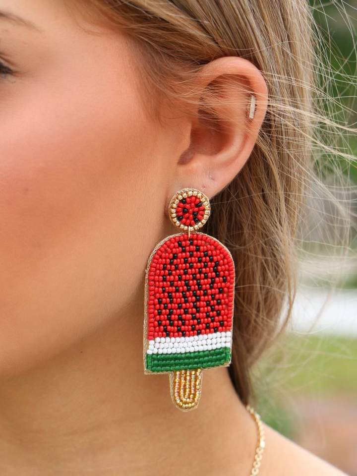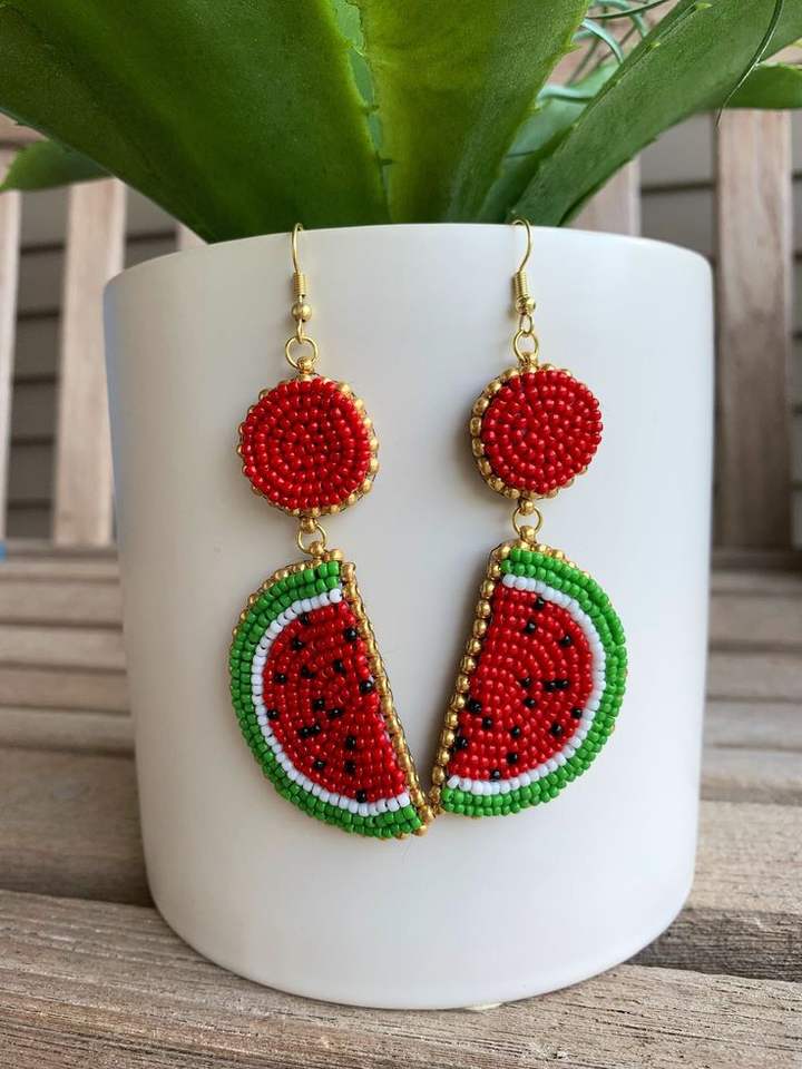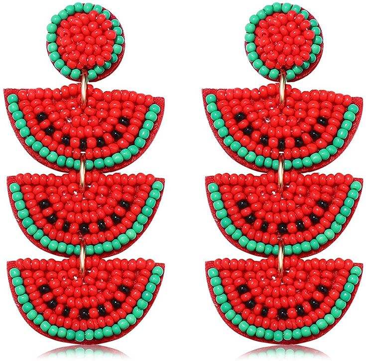 ต่างหูรูปแตงโมหั่นเป็นชิ้น ประดับลูกปัด สีแดง เขียว ขาว ดำ ทำด้วยมือ เครื่องประดับแฟชั่น ดีไซน์ผลไม้ ลุคฤดูร้อน