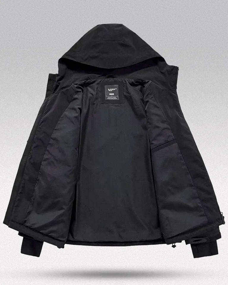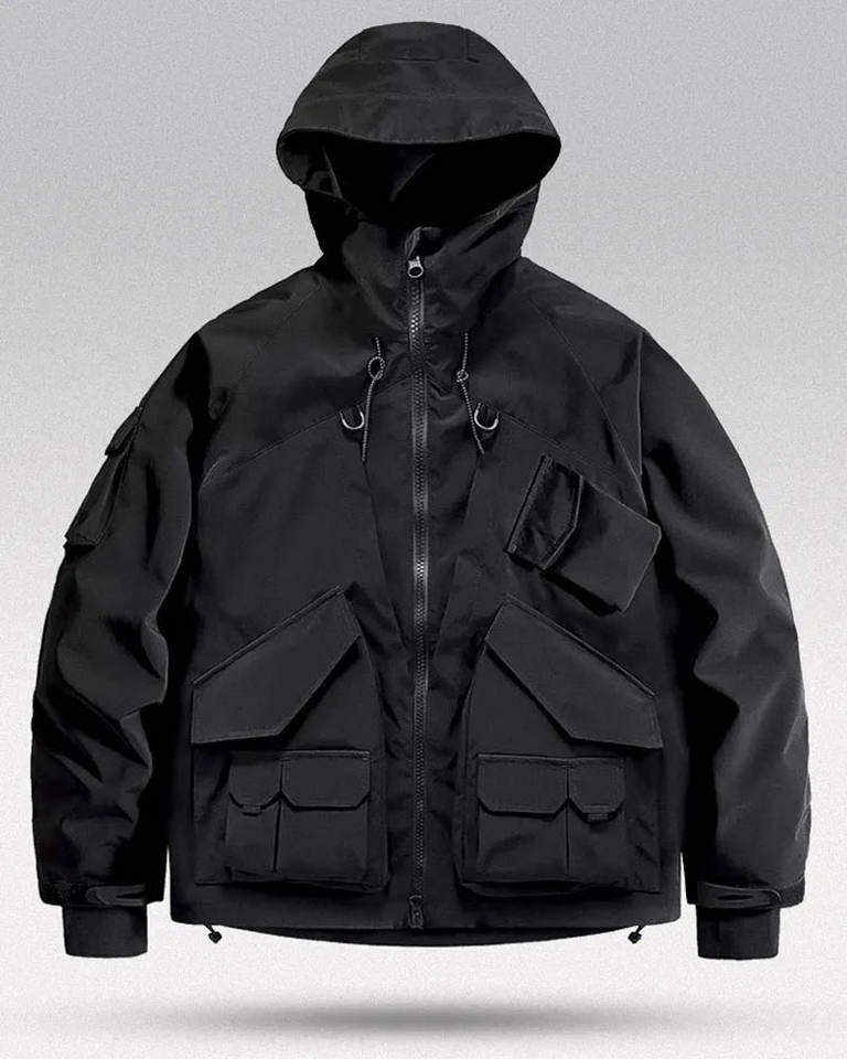 เสื้อแจ็คเก็ตเทคแวร์กันน้ำสำหรับผู้ชาย แบบมีฮู้ด หลายกระเป๋า สไตล์คาร์โก้ กันลม สตรีทแวร์ ไซเบอร์พังก์ เสื้อคลุมอเนกประสงค์