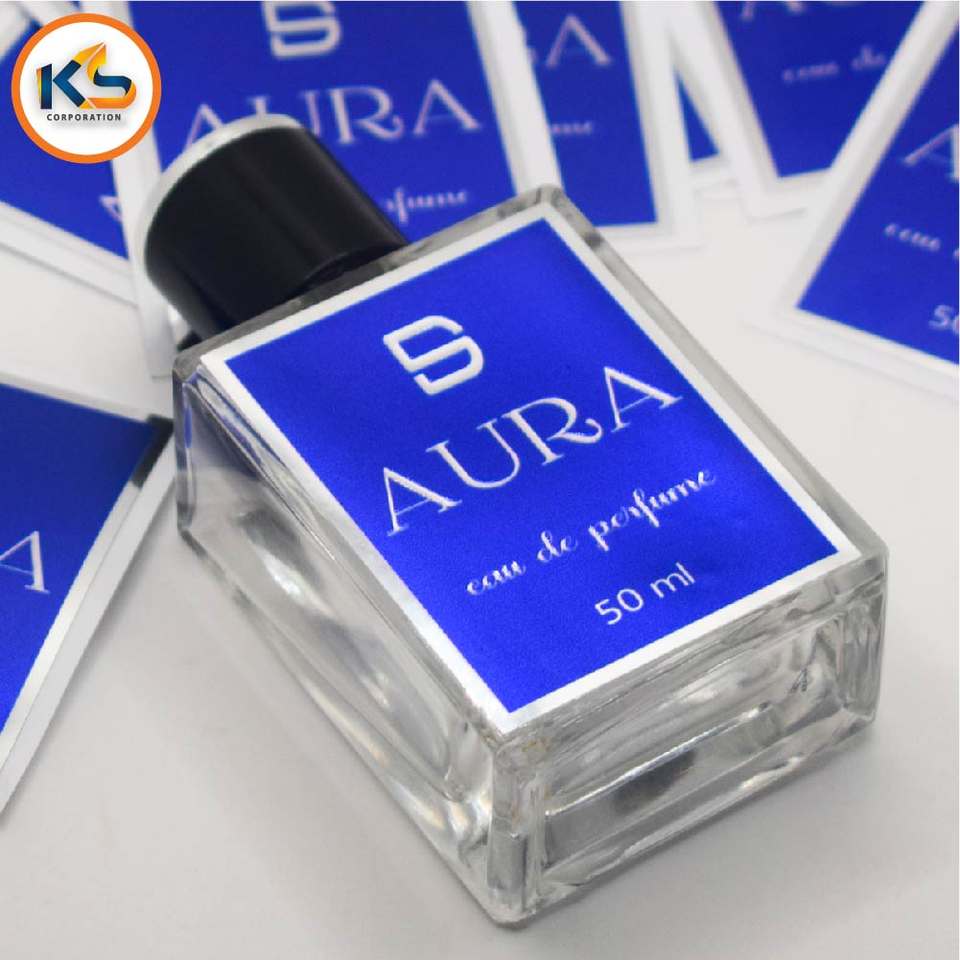 สติกเกอร์กันน้ำแบบด้านเคลือบเมทัลลิกสำหรับบรรจุภัณฑ์ขวดน้ำหอมสุดหรู | สติกเกอร์ฉลากน้ำหอมฟอยล์เงินแบบกำหนดเอง