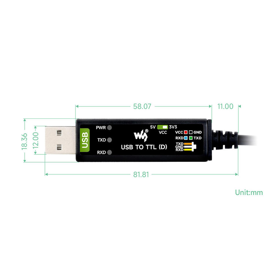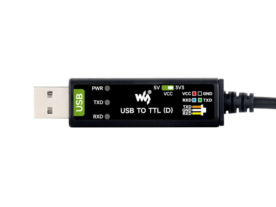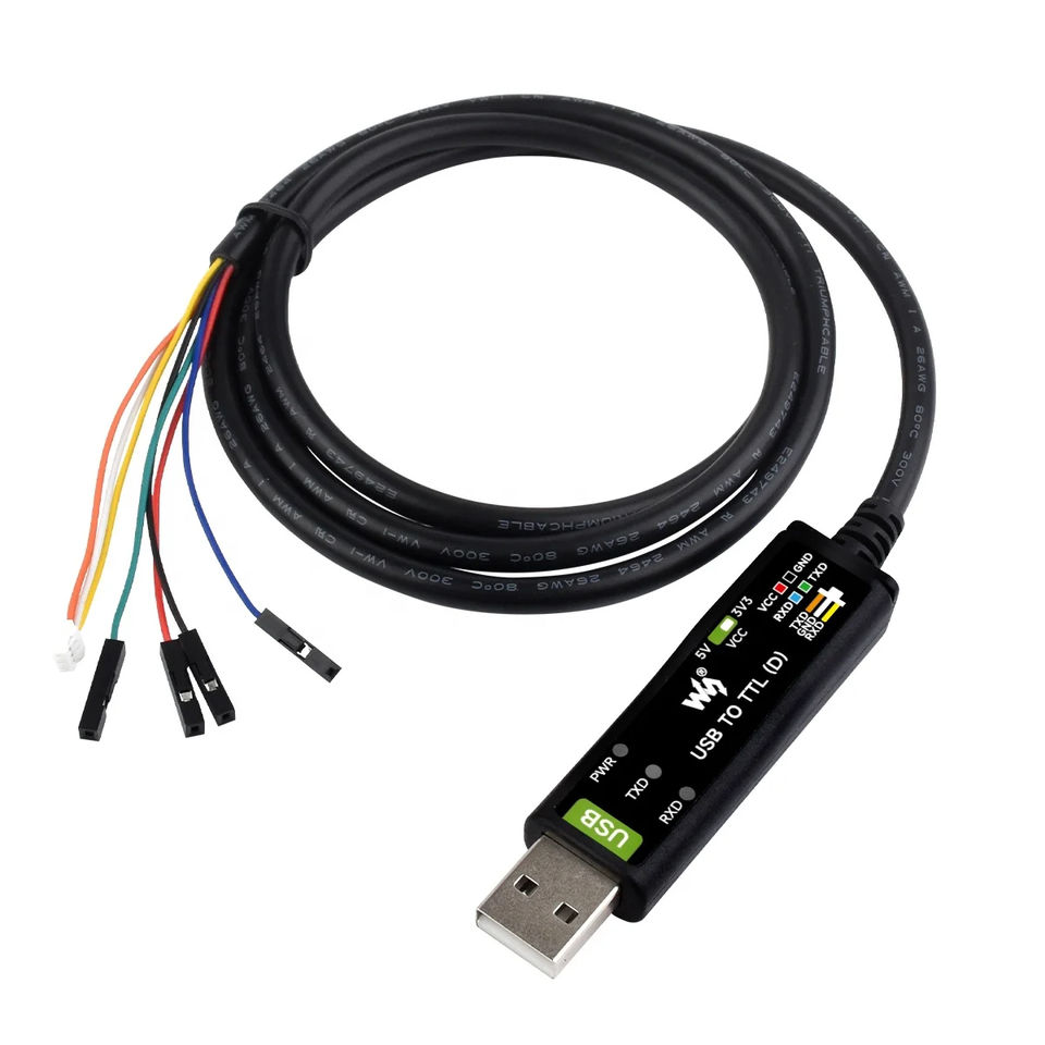 Waveshare สายเคเบิลอนุกรม USB TTL (D) ชิป FT232RNL สีดำผลิตจากจีนสำหรับการแก้จุดบกพร่องพอร์ตอนุกรม Pi 5
