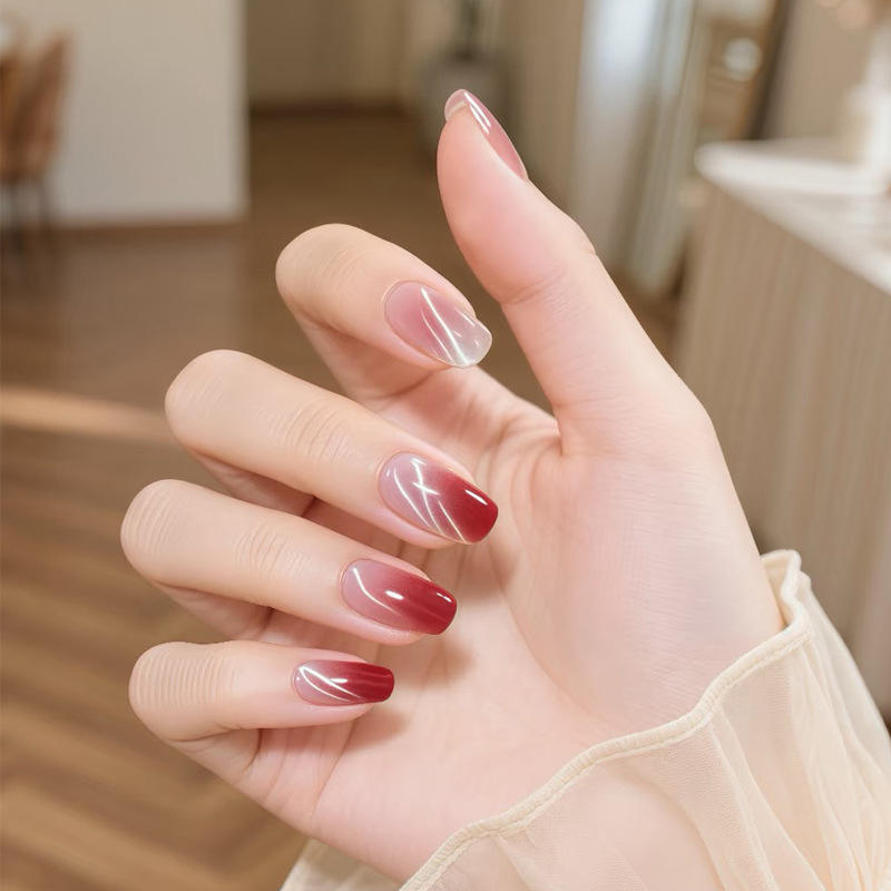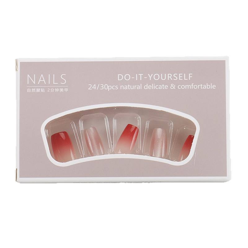 เล็บที่สวมใส่ได้แบบสั้นสีแดงสีชมพูการไล่ระดับสีรอยเปื้อนสำหรับสาวฮอตสติกเกอร์ตกแต่งเล็บอเนกประสงค์สำเร็จรูป