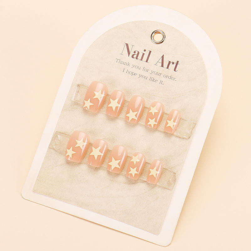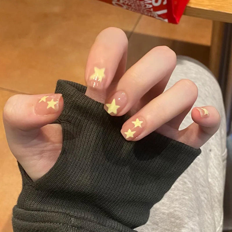 เล็บแบบสวมใส่ได้ TikTok ปลายเล็บสั้นสดใสรูปแมวดาวห้าแฉกแบบเรียบง่ายโดพามีนสำหรับฤดูร้อน