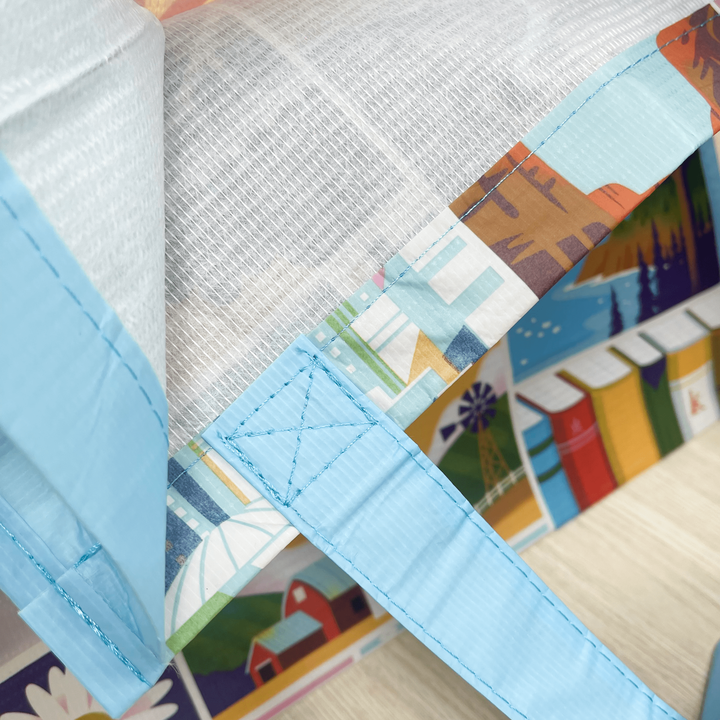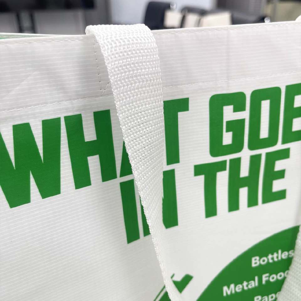 กระเป๋าช้อปปิ้งแบบมีหูหิ้วลายจุด ผลิตจากเวียดนาม มีซิป สะพายไหล่ ผลิตตามสั่ง ทำจากผ้า PP รีไซเคิล และ RPET