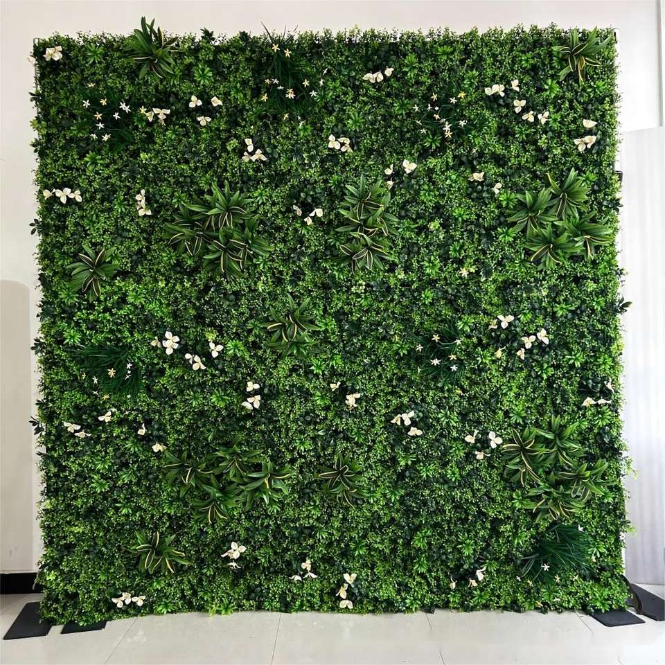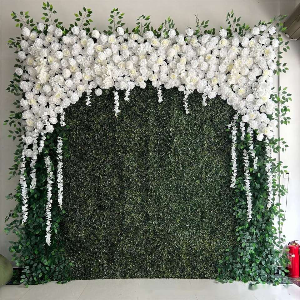 ฉากหลังตกแต่งงานแต่งงาน ผนังดอกไม้ประดิษฐ์ ฉากหลังหญ้าสีเขียวพร้อมดอกไม้ประดับตกแต่งผนัง