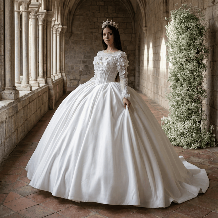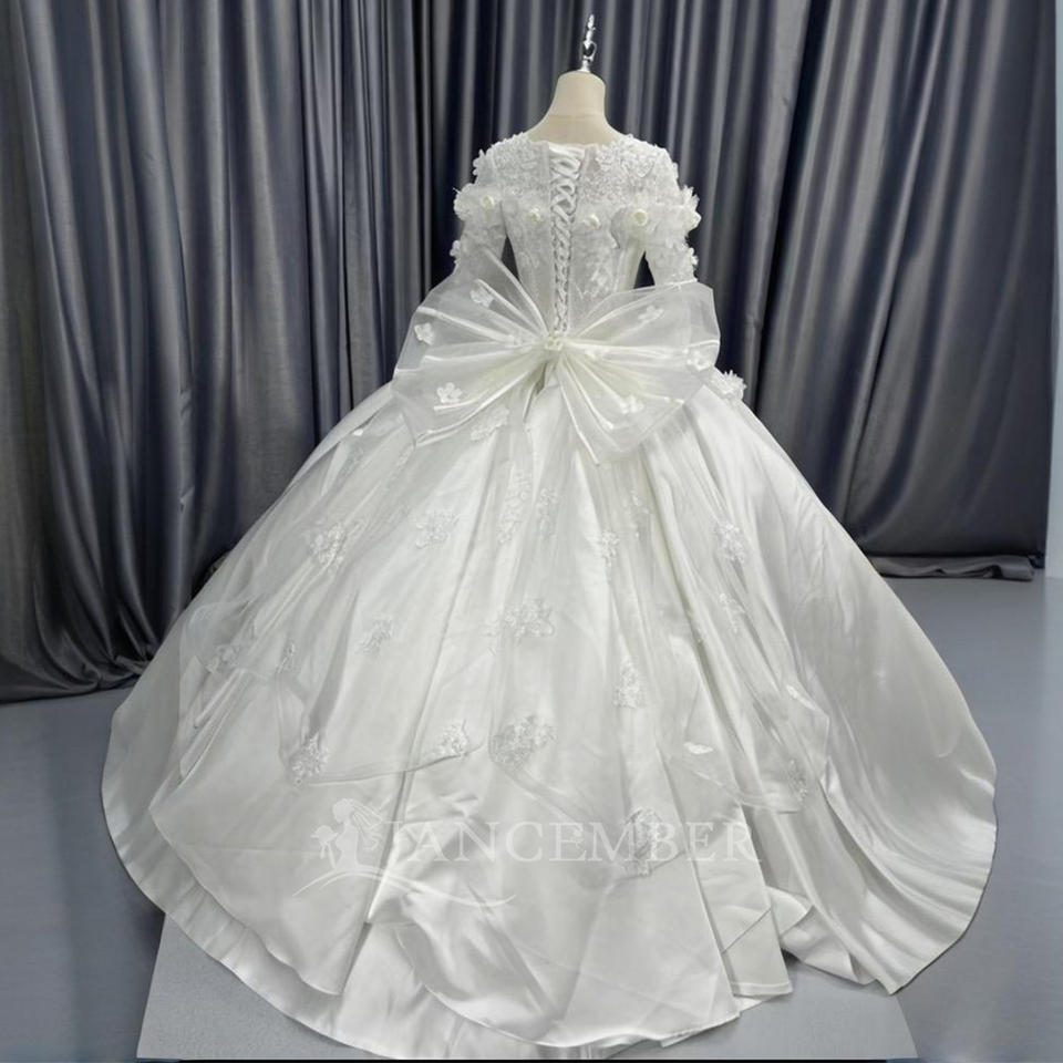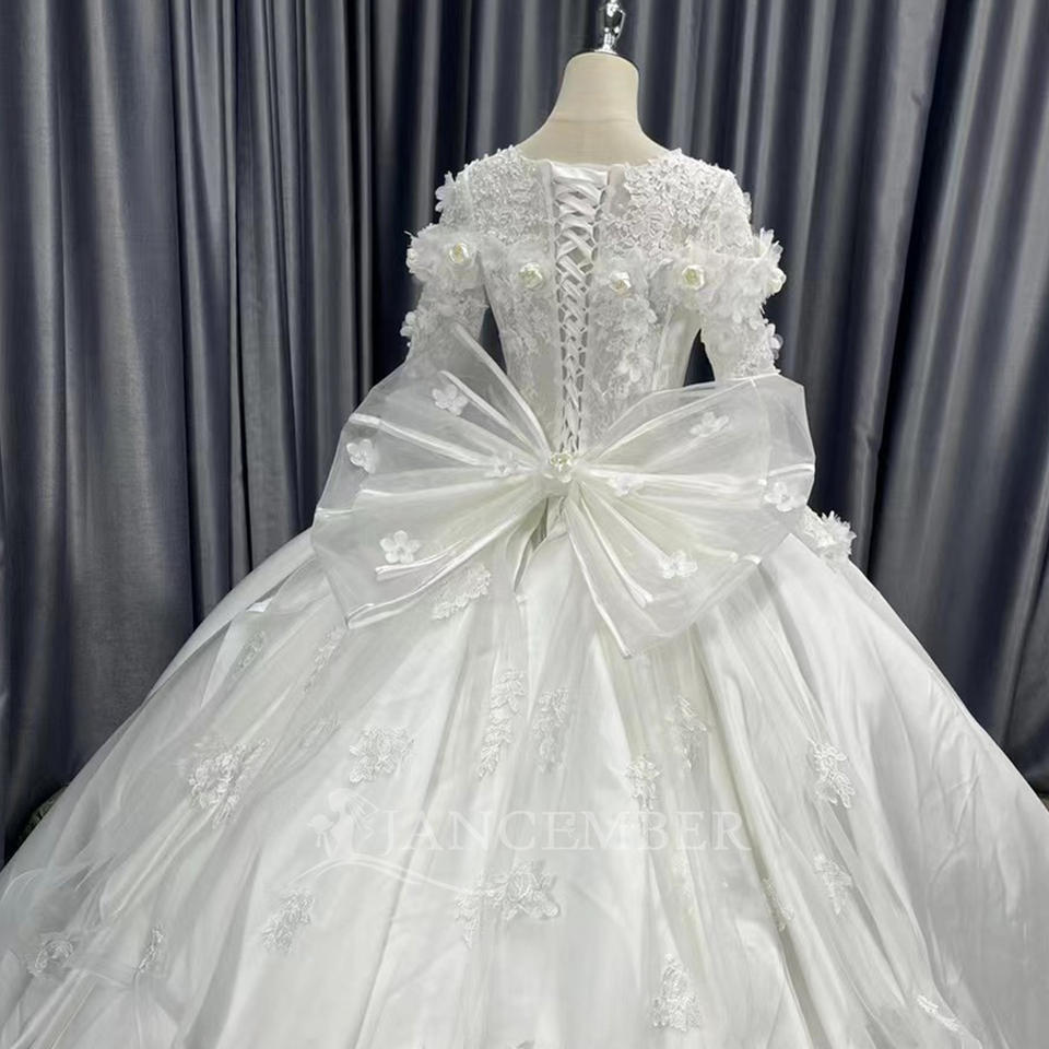 ชุดแต่งงานทรงบอลกาวน์ ผ้าซาติน ประดับด้วยลูกไม้ลายดอกไม้ ปักด้วยลูกปัด ยาวลากพื้น พร้อมชายกระโปรงยาวแบบชาเปล สำหรับ LSCM12