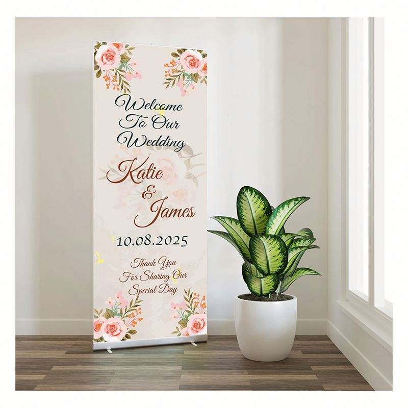 ป้ายดอกไม้งานแต่งงานแบบดึงขึ้นได้ ป้ายพิมพ์ดิจิทัลแบบม้วนเก็บได้ ป้ายต้อนรับพร้อมขาตั้ง อุปกรณ์ตกแต่งสำหรับแสดงผลงาน