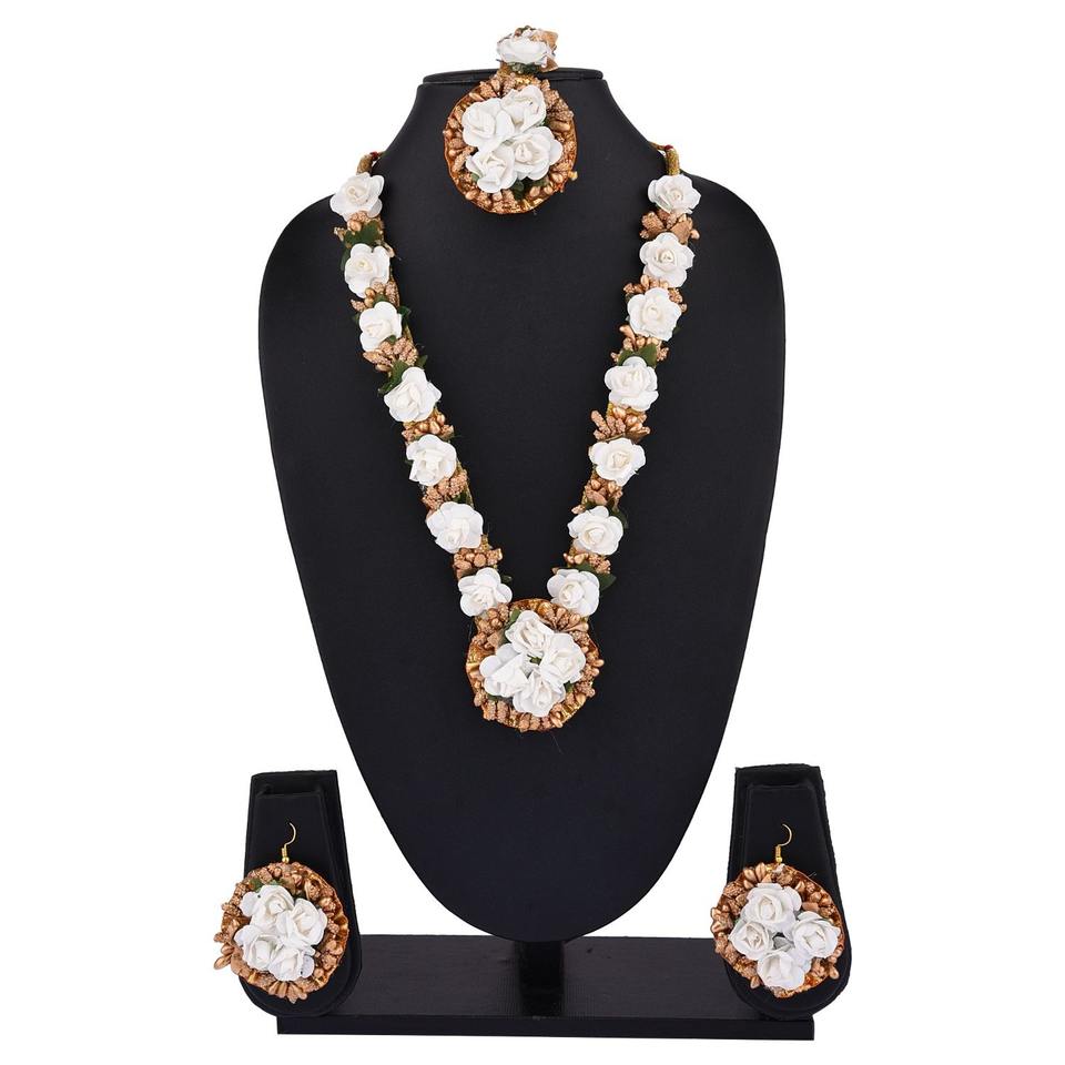 ชุดเครื่องประดับแต่งงานฮาลดิดอกไม้ทำมือสำหรับเจ้าสาวพร้อมสร้อยคอต่างหูและชุดทิกก้า