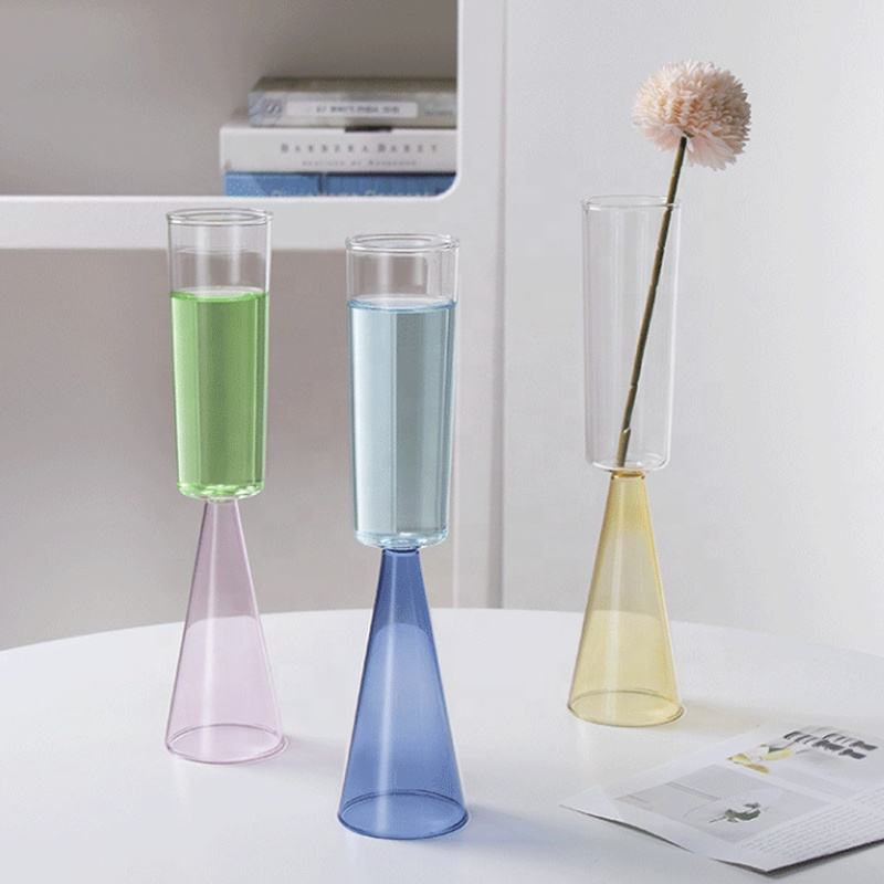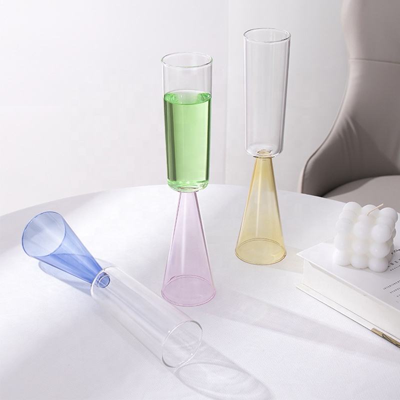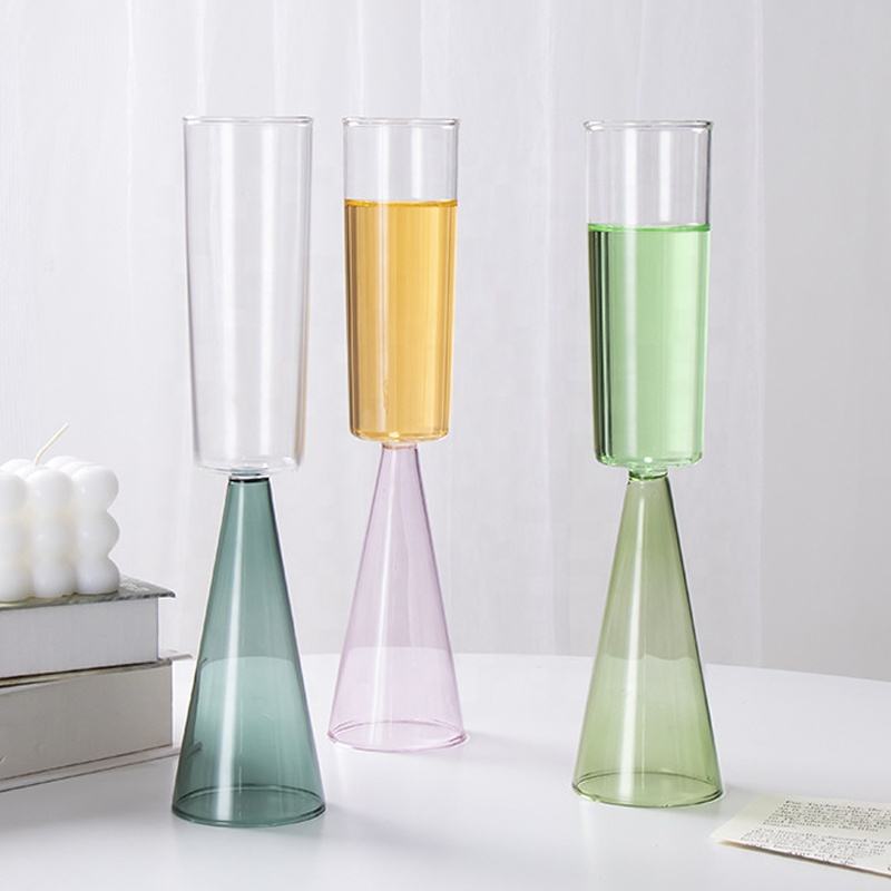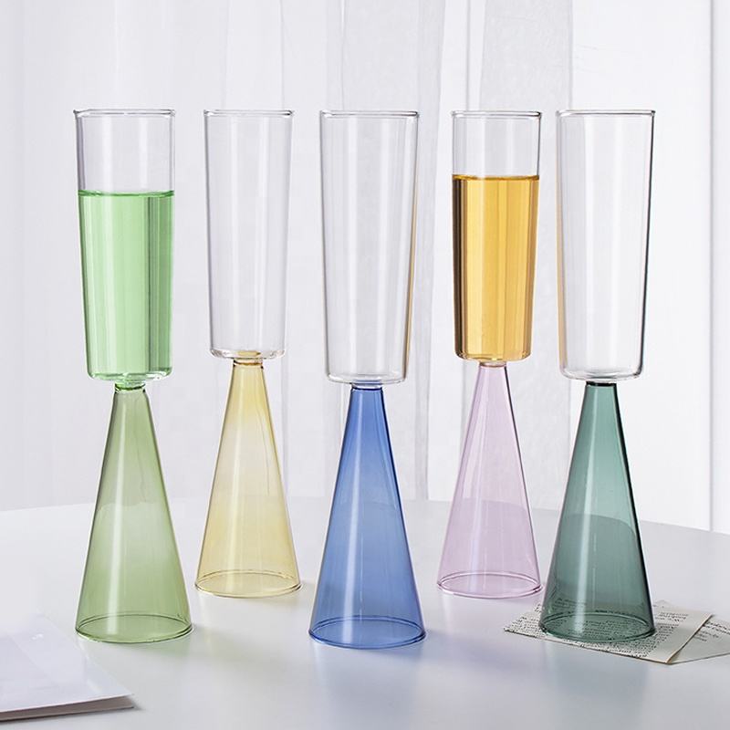 แก้วไวน์ทรงกรวยก้านสูงเป่าด้วยมือสำหรับงานแต่งงาน แก้วแชมเปญทรงฟลุตสีฟ้า เขียว เหลือง ชมพู ทำจากแก้วโบโรซิลิเกตคุณภาพสูง