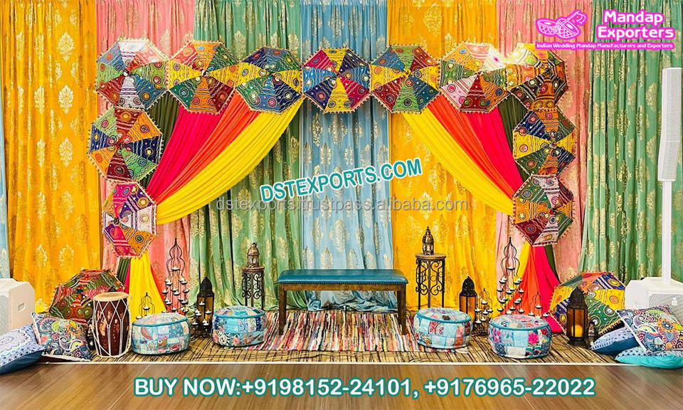 ฉากหลังของการตกแต่งสำหรับงานแต่งงานขนาด mehindi และ haldi มีหลายสีฉากหลังผ้าม่านสำหรับติดเวทีที่ดีที่สุดสีสันสดใสสำหรับ Sangeet