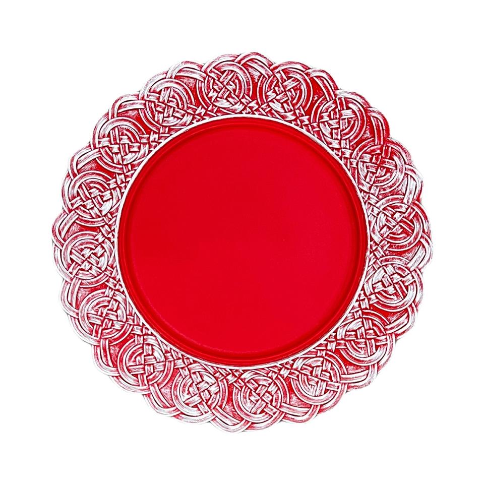 จานรองอาหารงานแต่งงาน งานเลี้ยง งานอีเว้นท์ ทรงกลม ตกแต่งสไตล์โบราณ ขนาด 13 นิ้ว ขอบลายนูน ผลิตจากพลาสติก จำหน่ายจำนวนมาก