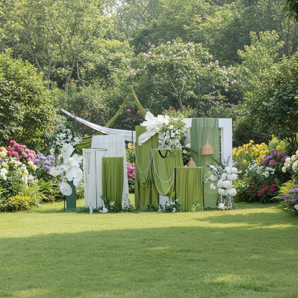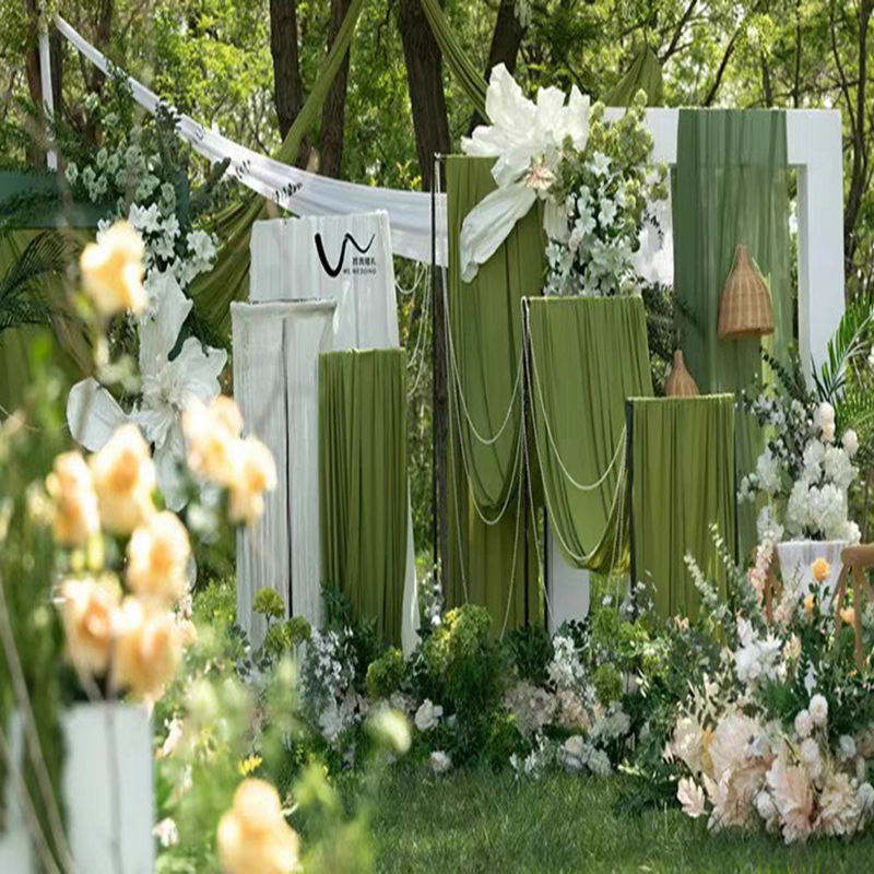 ฉากหลังผ้าม่านโค้งสไตล์เรียบง่ายสำหรับงานแต่งงาน ผ้าม่านผ้าไหมสีน้ำนม พร้อมผ้าสีเขียวสำหรับตกแต่งเวทีกลางแจ้งและเพดานงานแต่งงาน