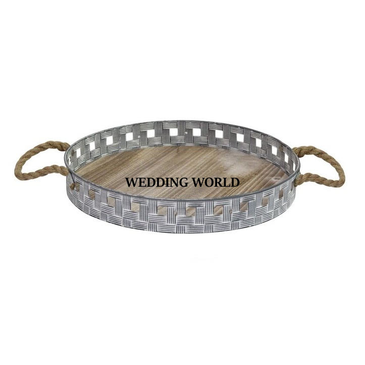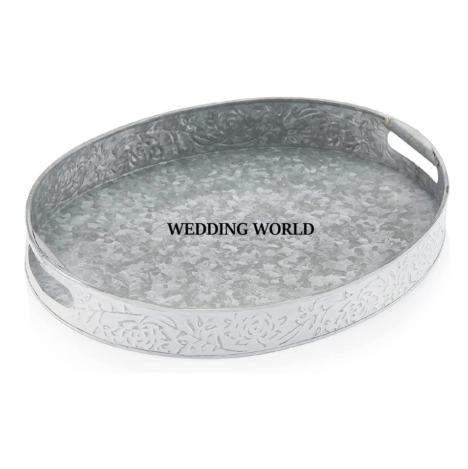 อุปกรณ์สำหรับงานแต่งงานถาดเสิร์ฟอาหารชุบสังกะสีทำมือทรงกลมอุปกรณ์รับประทานอาหารสุดหรูดีไซน์เนอร์ขายส่งถาดเสิร์ฟโลหะ