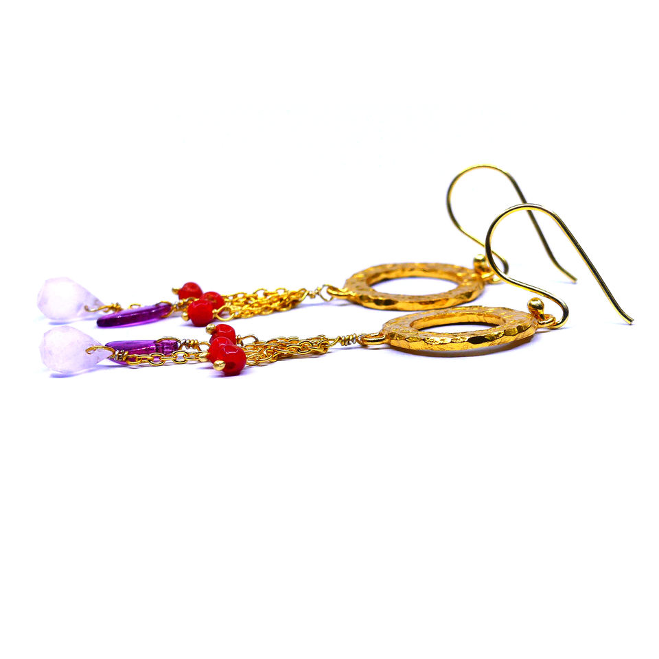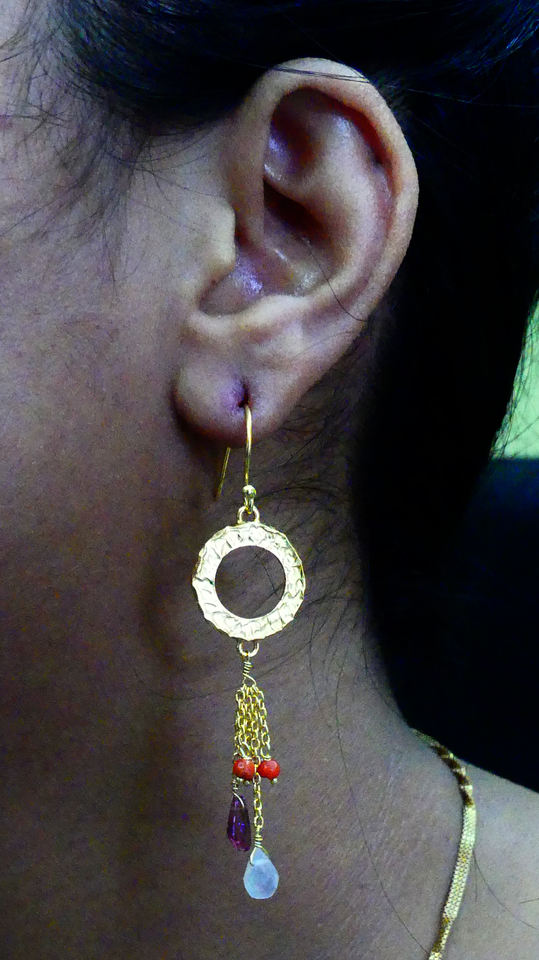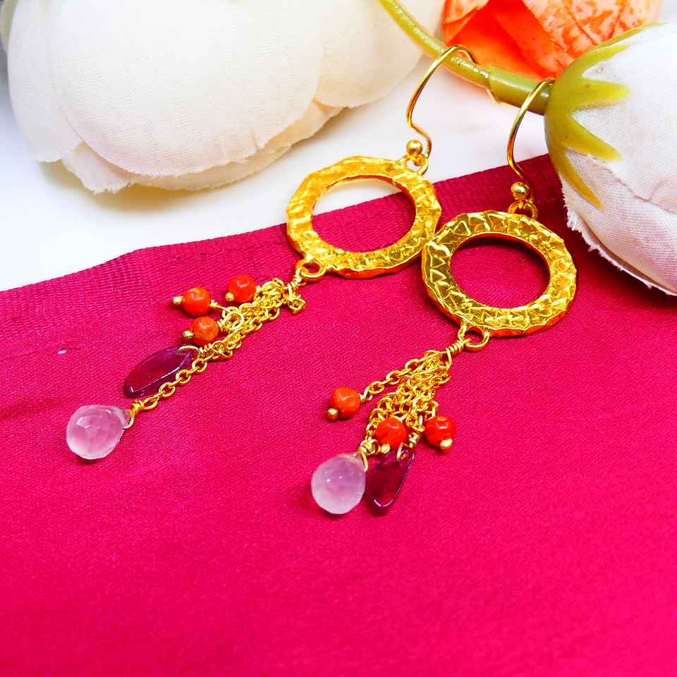 ชุดแต่งงาน 925 เงินสเตอร์ลิงทองชุบปะการังโรสควอตซ์ทัวร์มาลีนอัญมณีแขวนต่างหูโซ่