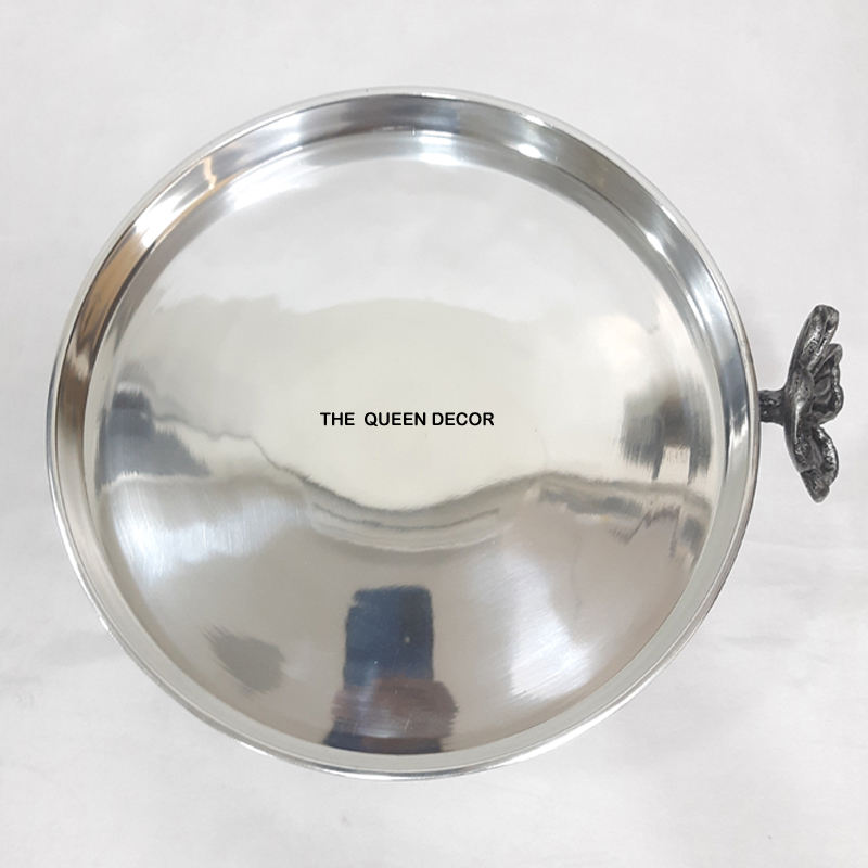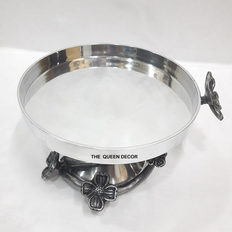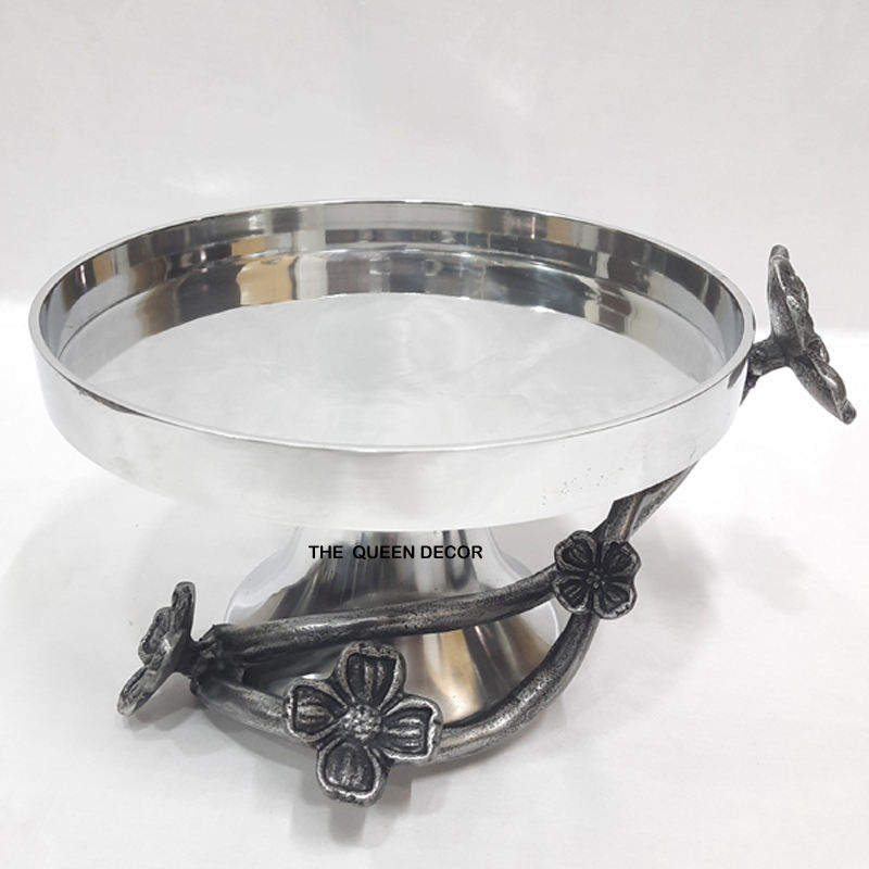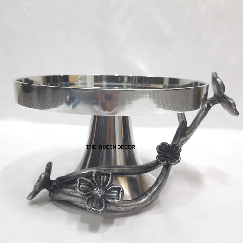 ขาตั้งเค้กอะลูมิเนียมทรงกลมสำหรับงานแต่งงานและงานเลี้ยง ตกแต่งด้วยดอกไม้ด้านข้าง ดีไซน์สวยงาม เงางาม
