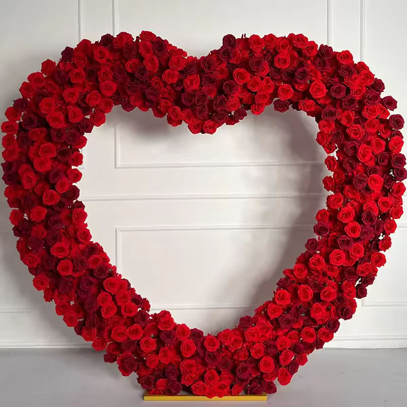 ซุ้มดอกไม้ประดิษฐ์รูปหัวใจสีแดงสำหรับงานแต่งงาน ฉากหลังผ้าสำหรับงานแต่งงานกลางแจ้ง ตกแต่งสนามหญ้า ฉากหลังหน้าต่าง