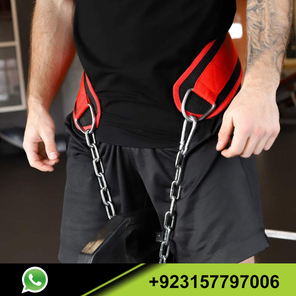 โลโก้ที่กำหนดเองเข็มขัดยกน้ำหนักสีแดงพร้อมโซ่เหล็กเข็มขัดยกน้ำหนักจุ่มเข็มขัดออกกำลังกายฟิตเนสยิมสร้างร่างกาย