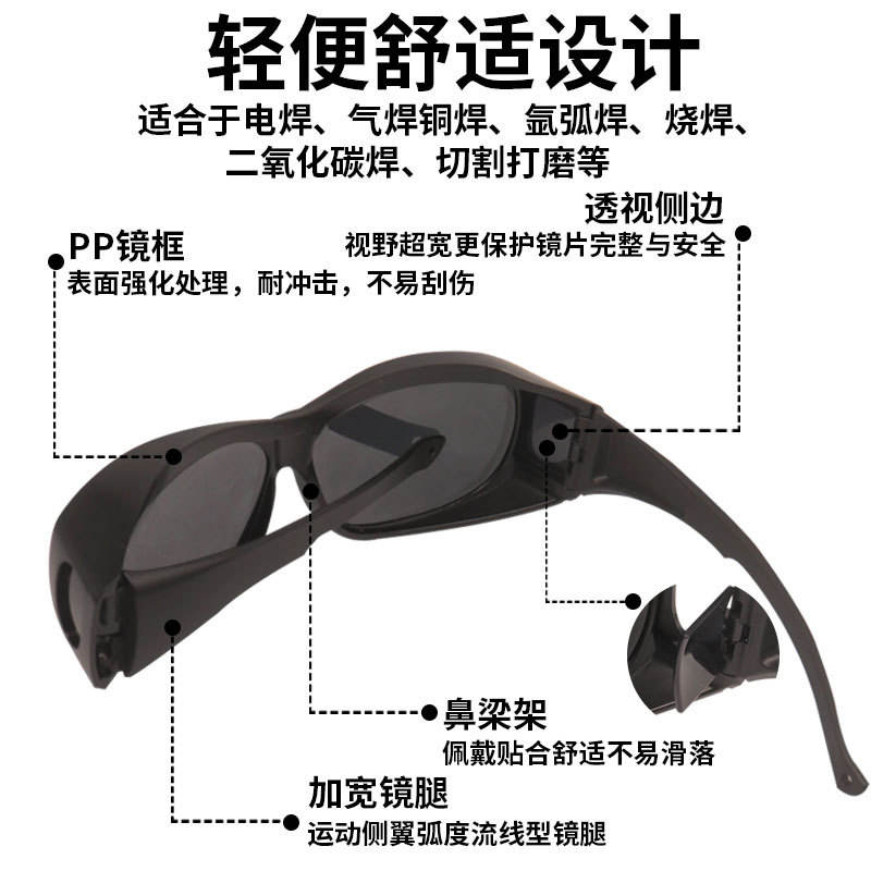 แว่นตาป้องกันสำหรับช่างเชื่อม กรอบสีดำ เลนส์หนา 2 มม. ความโปร่งแสง 10% แว่นตานิรภัยสำหรับเลเซอร์ สำหรับการเชื่อมอาร์คและการเชื่อมอาร์กอน