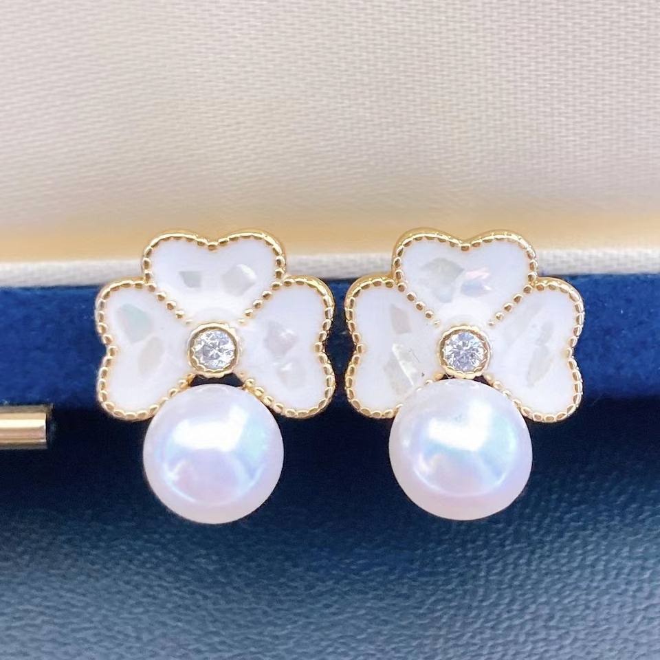 ต่างหูแฟชั่นผู้หญิง ดีไซน์รูปใบโคลเวอร์สี่แฉก ประดับมุกน้ำจืดและลูกปัดมันตู ขนาด 6-7 นิ้ว ดีไซน์จูจี้