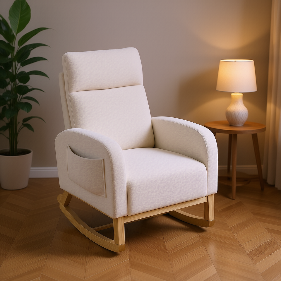เก้าอี้โยกสไตล์โมเดิร์น Welike พนักพิงสูง สีขาวเท็ดดี้ ขาไม้สีขาว เฟอร์นิเจอร์ห้องนั่งเล่น