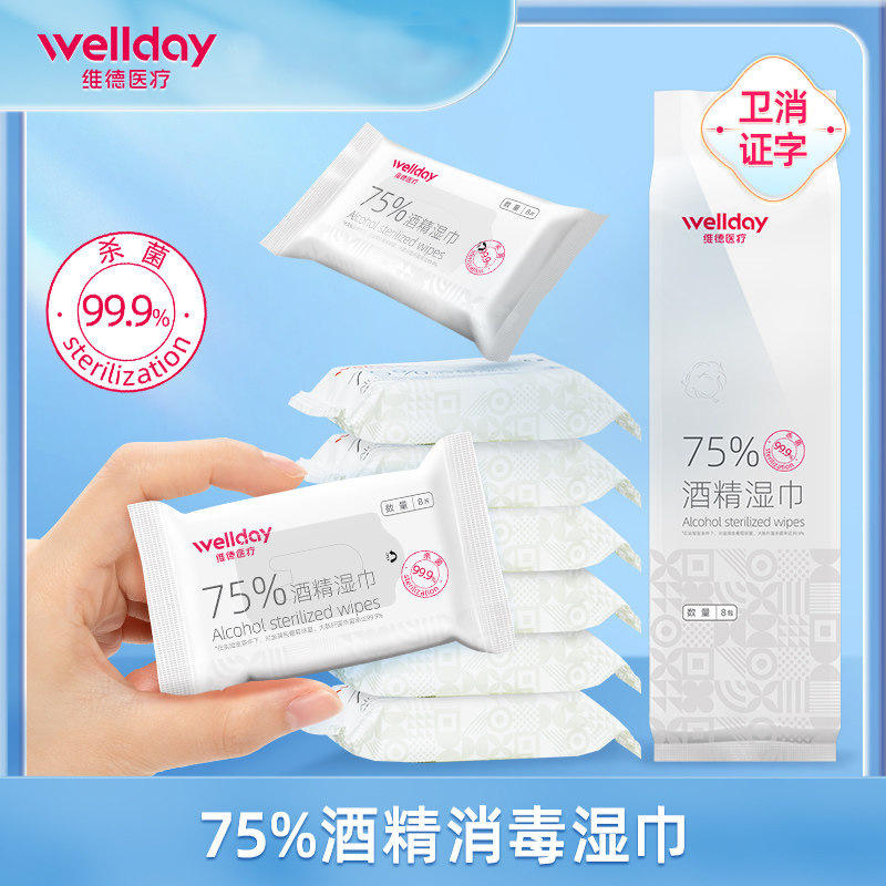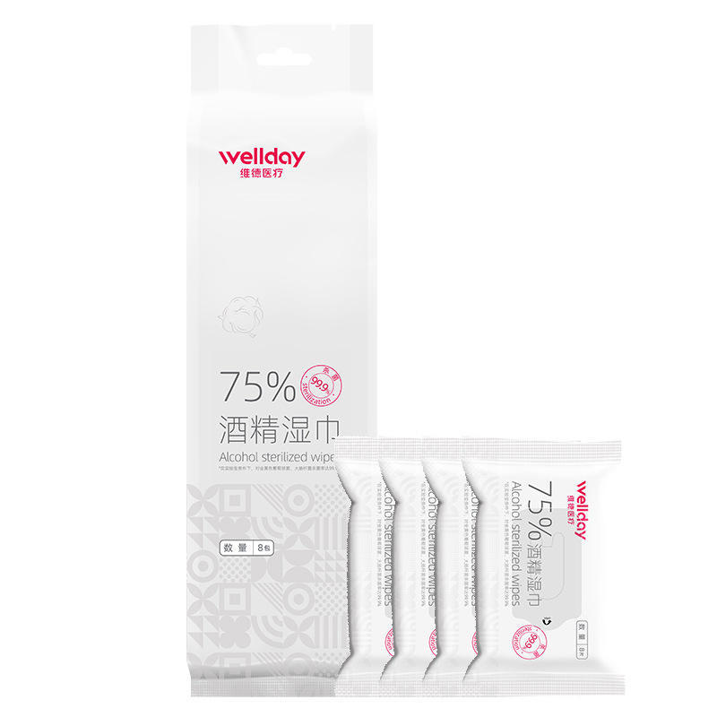เวลเดย์ ผ้าเช็ดทำความสะอาดฆ่าเชื้อแอลกอฮอล์ 75% 8 แพ็ค ผ้าเช็ดทำความสะอาดฆ่าเชื้อแบคทีเรียแบบพกพาสำหรับการพยาบาลและการใช้งานประจำวัน