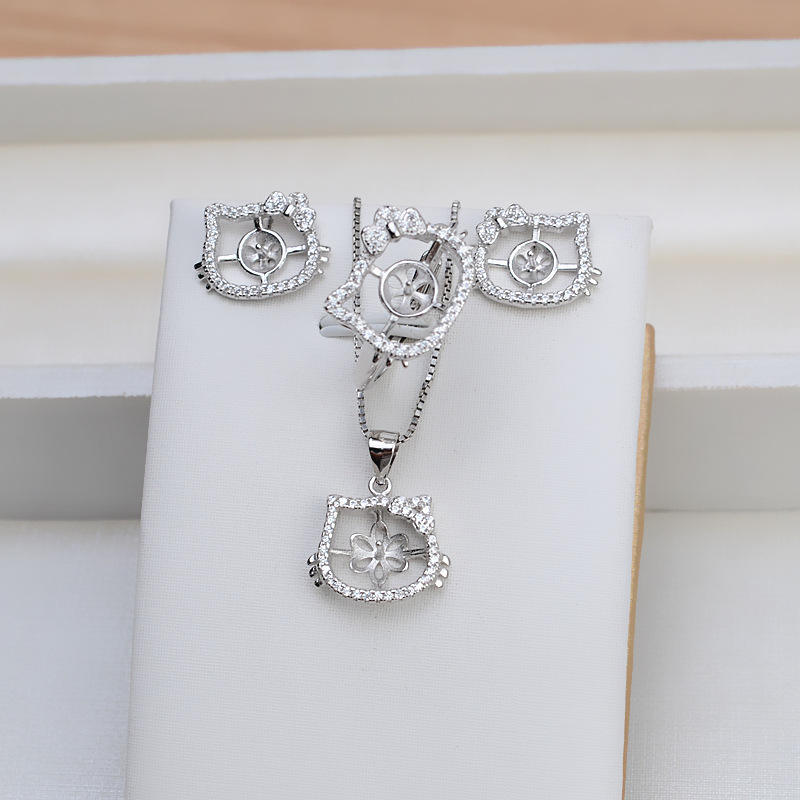 ชุดเครื่องประดับแฟชั่น DIY ยี่ห้อ Wenchi พร้อมต่างหูเงินแท้ S925 รูปแมวคิตตี้ จี้ แหวนเปิด ดีไซน์ทันสมัย ประดับมุก รุ่นจีน 16651