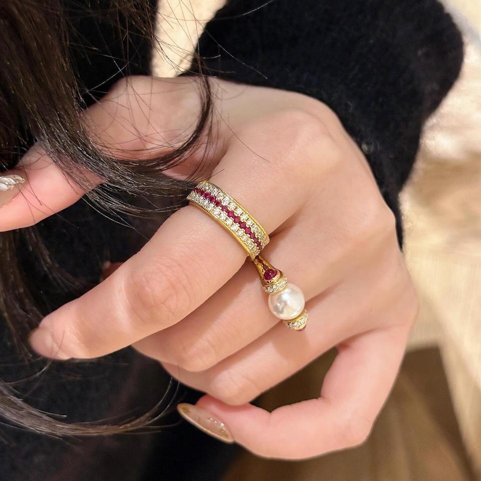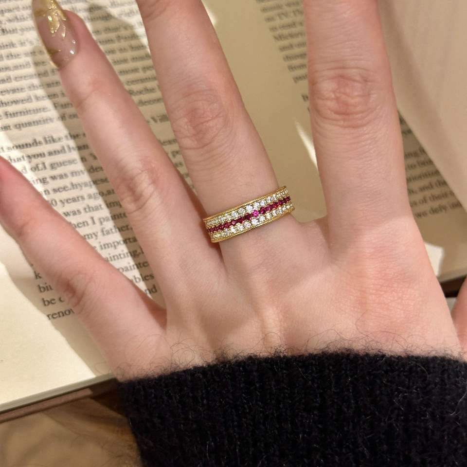 เวนชี เอส 925 เงินสเตอร์ลิง แหวนดีไซน์คลาสสิก หรูหรา วินเทจ ประดับเพชรสามแถว พลอยสีแดง ประดับกุหลาบอย่างสวยงาม