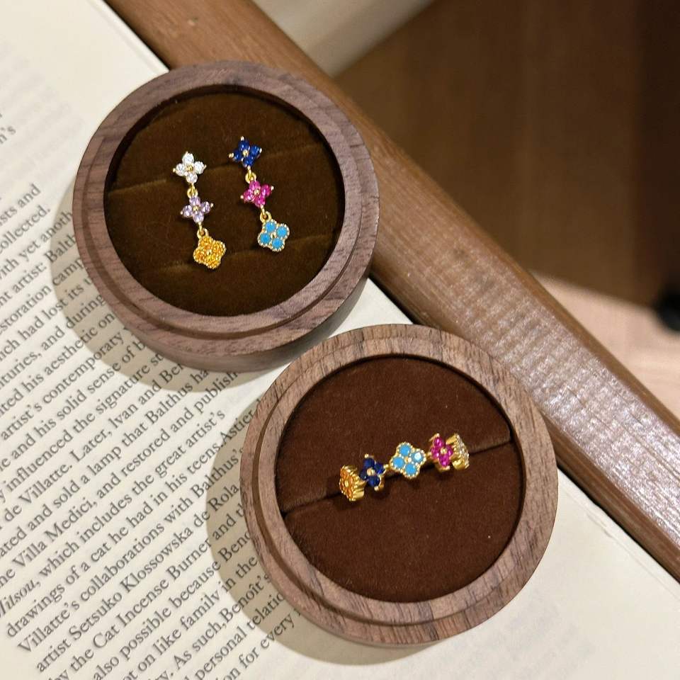 Wenchi S925 Sterling Silver Sweet Dopamine Inlaid Diamond Ring Earrings Rainbow Four Leaf Flower Clover Jewelry Set Fashionable
