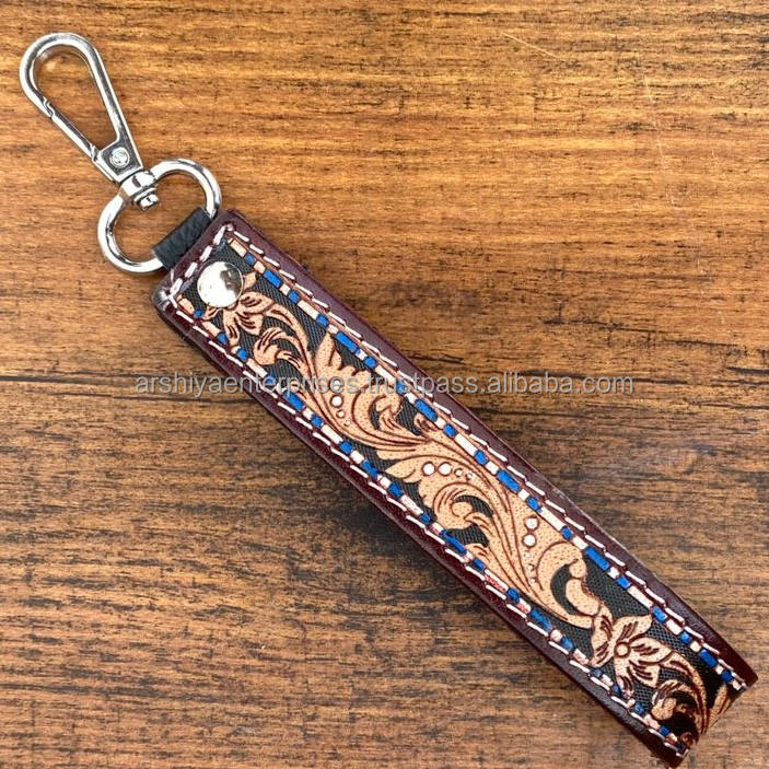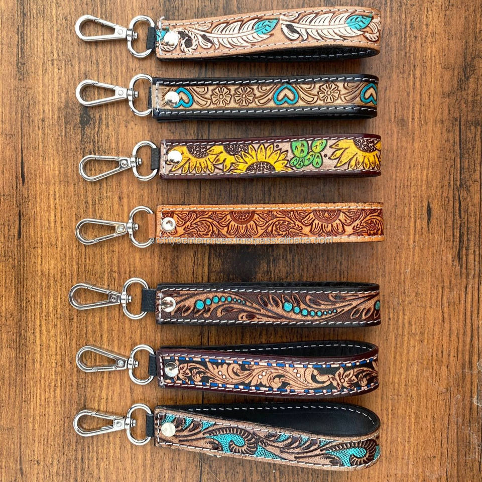 พวงกุญแจหนังสลักลายดอกไม้แบบตะวันตกพวงกุญแจหนังอุปกรณ์เสริมพวงกุญแจน่ารัก