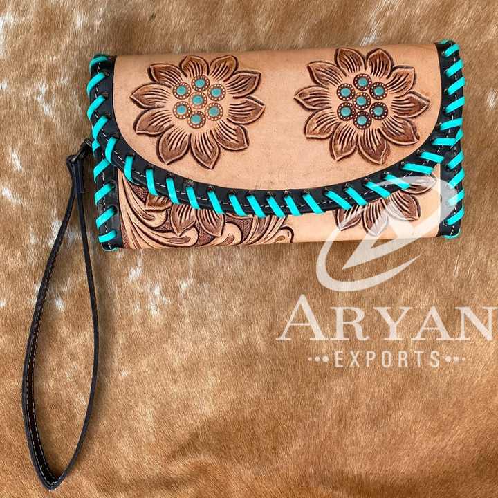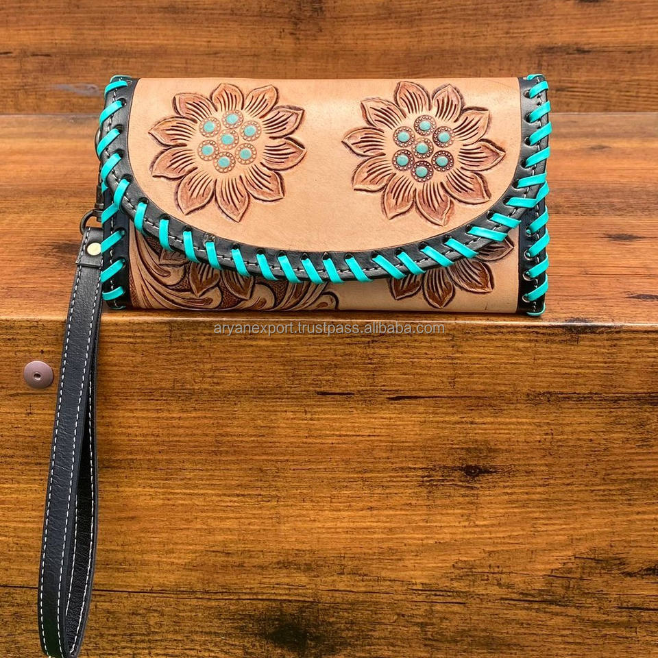 เคสโทรศัพท์ลายคลัทช์แกะสลักด้วยมือสไตล์ตะวันตกมีขอบสีเทอร์ควอยซ์