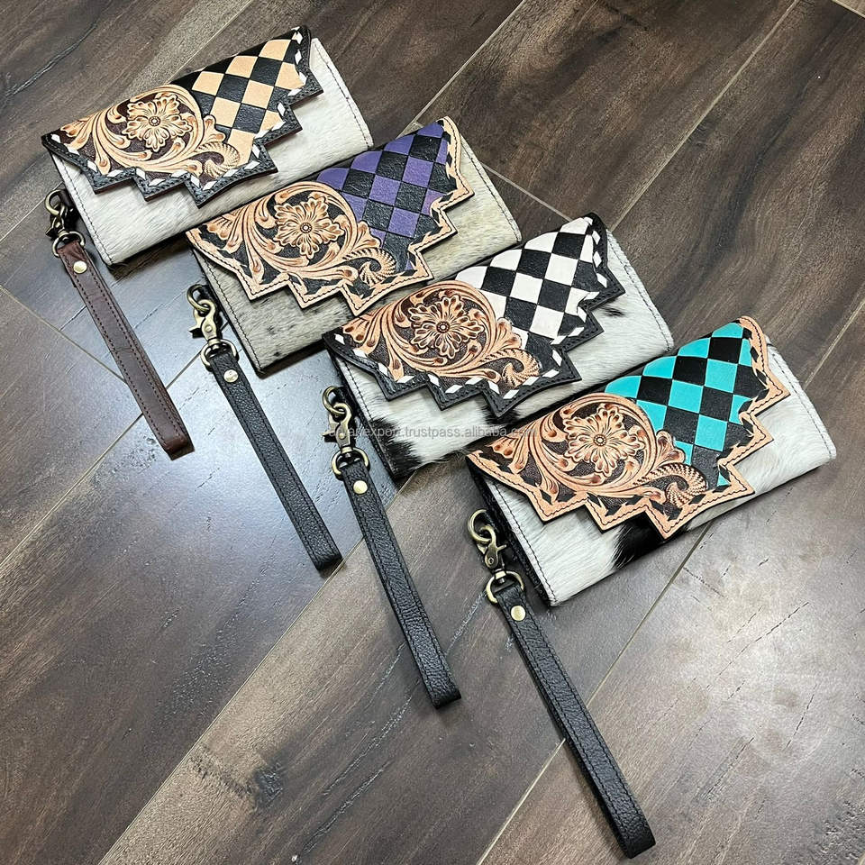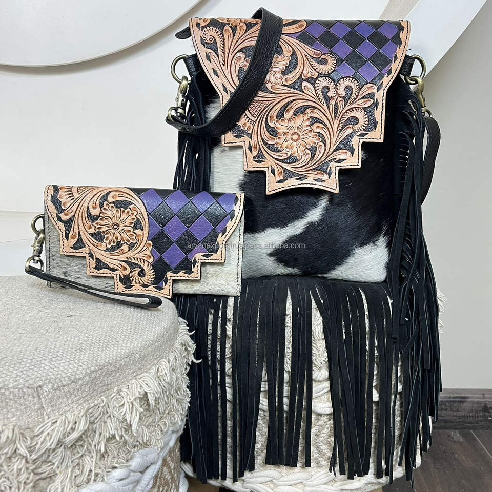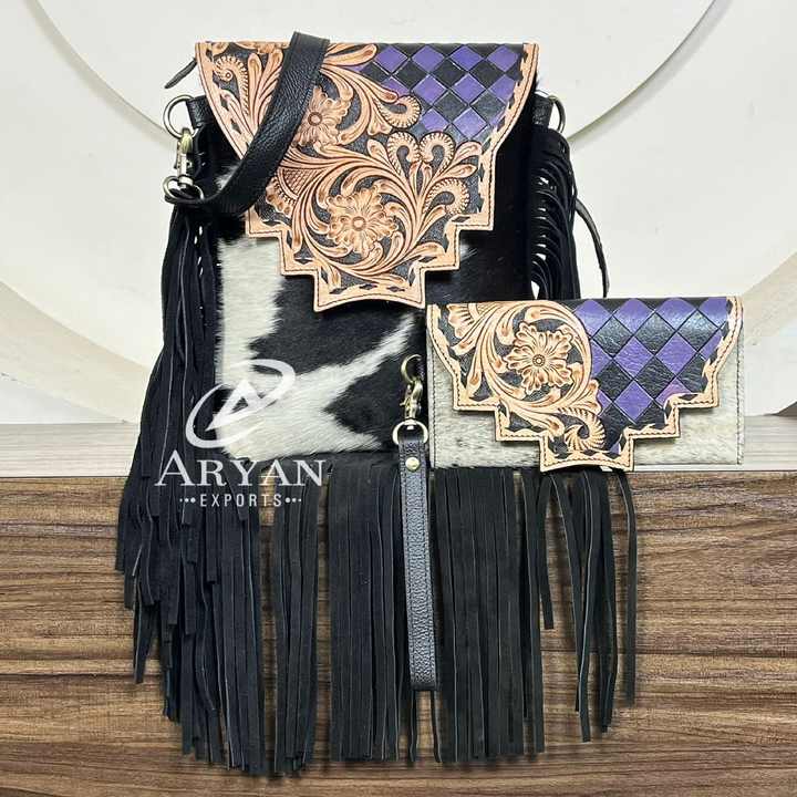 Western Hand Tooled Cow Leather Fringe Crossbody Bag with Turquoise Diamond & Matching Wallet Set Handcrafted Boho Style Purse