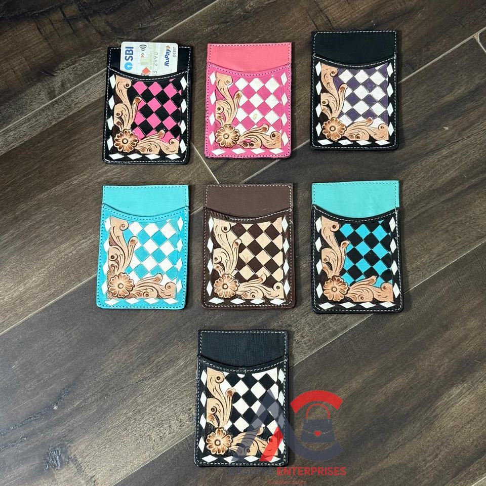 Hand Tooled Checkered Leather Credit Card Holder Wallet