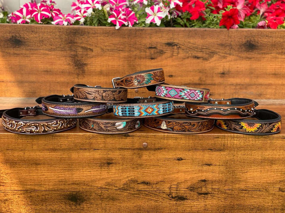 Western Hand Tooled Leather Beaded Dog Collars