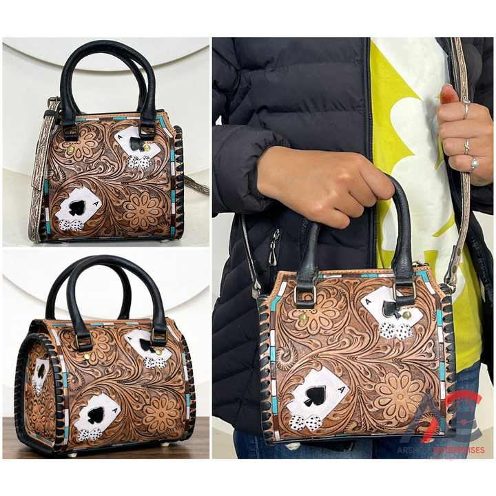 Western Hand Tooled Leather Mini Speedy Bag with Ace Of Spades Dice Design Handbag for Women Premium Cowhide Duffel Barrel Purse