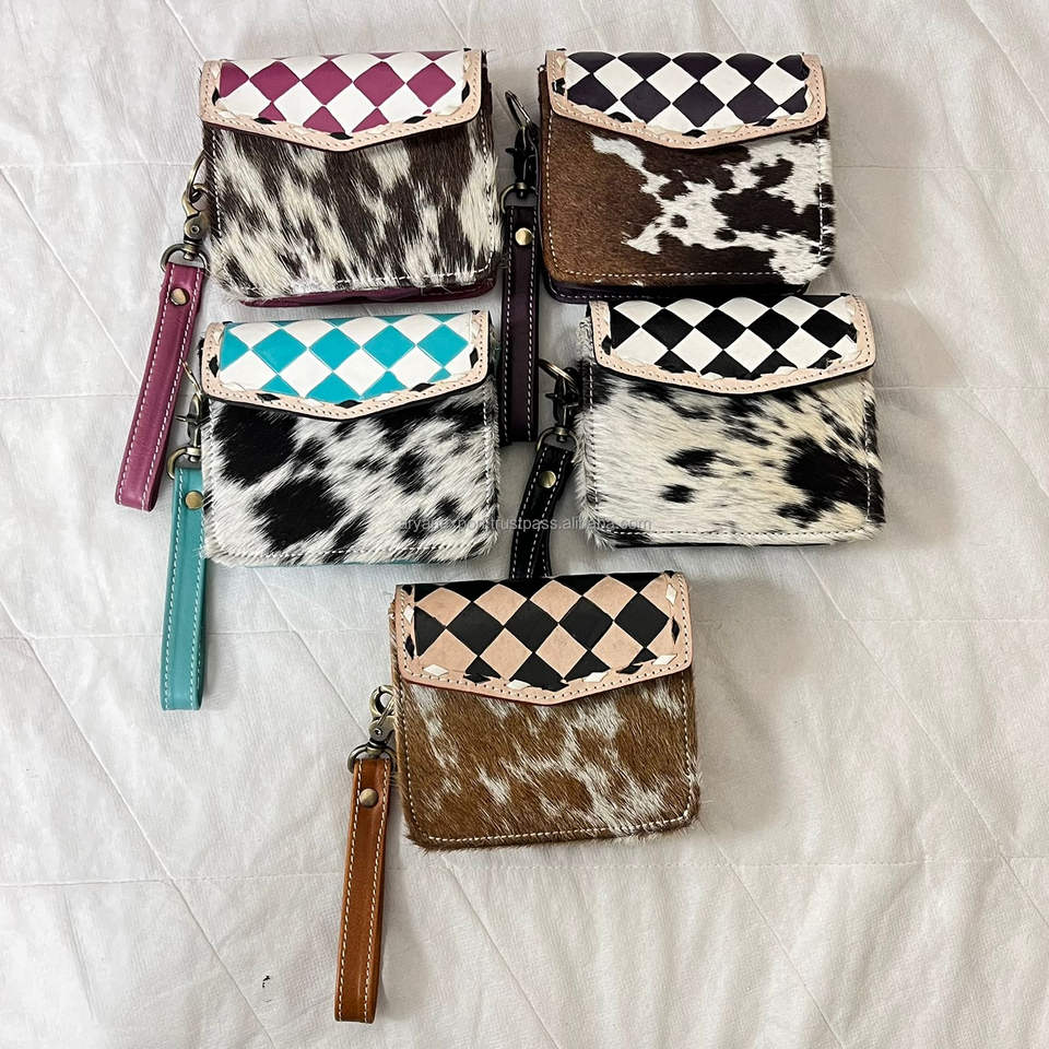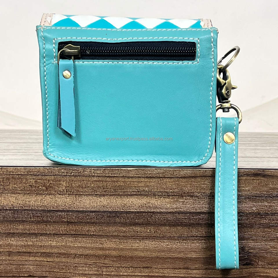 Western Handcrafted Genuine Cowhide Leather Coin Purse Turquoise & White Checkered Pattern Hair-on Leather Perfect for Women's