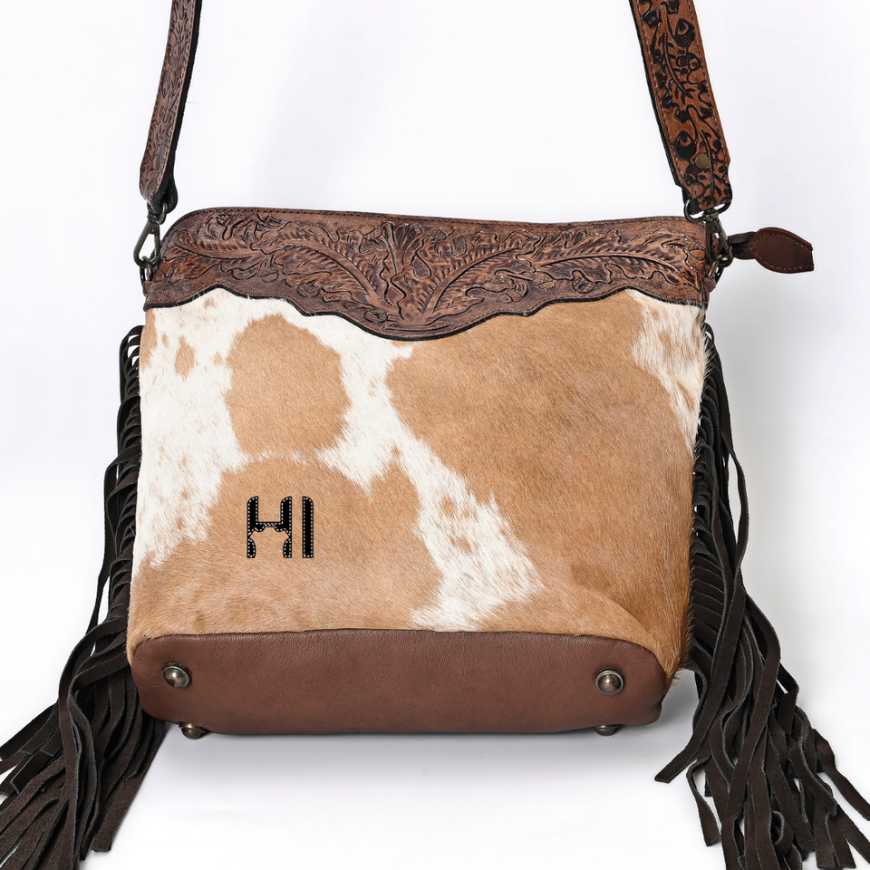 กระเป๋าหนังวัวแท้สไตล์ตะวันตก กระเป๋าสะพายข้างแบบคาวเกิร์ล พร้อมพู่ตกแต่งลายฉลุ