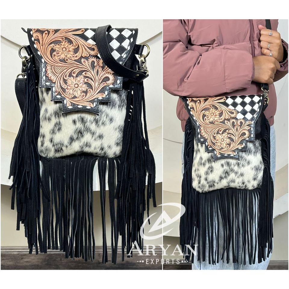 ชื่อสินค้า:กระเป๋าสะพายข้างหนังแท้ลายตารางประดับพู่ทำมือ