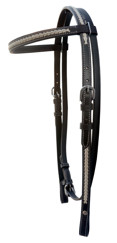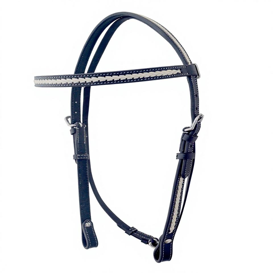 บังเหียนม้าแบบตะวันตก ปรับได้ ทำด้วยมือจากหนังแท้ สายคาดหน้าผากหนังดิบสีขาว สายคาดหน้าผากหนังสีดำ รุ่น 528