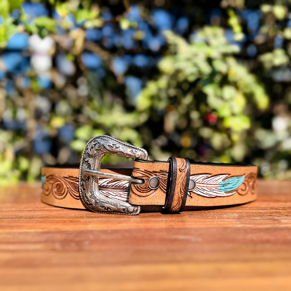 เข็มขัดหนังแท้สไตล์ตะวันตก ลายเพสลีย์ ทำด้วยมือจากหนังวัวแท้ หัวเข็มขัดโลหะผสมสังกะสี กว้าง 40 มม. ปรับแต่งได้