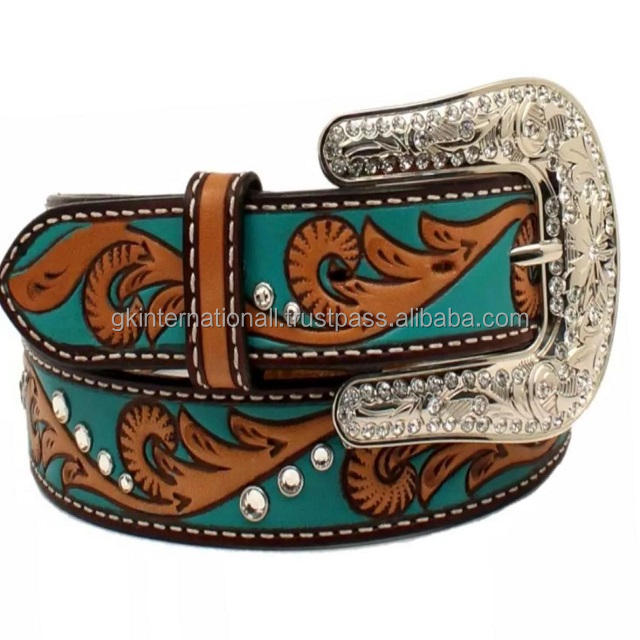 เข็มขัดหนังผู้ชายสไตล์ตะวันตกลายดอกไม้เข็มขัดหนังสีเทอร์ควอยส์มือแกะสลักลายดอกไม้สำหรับคาวบอยและคาวเกิร์ล