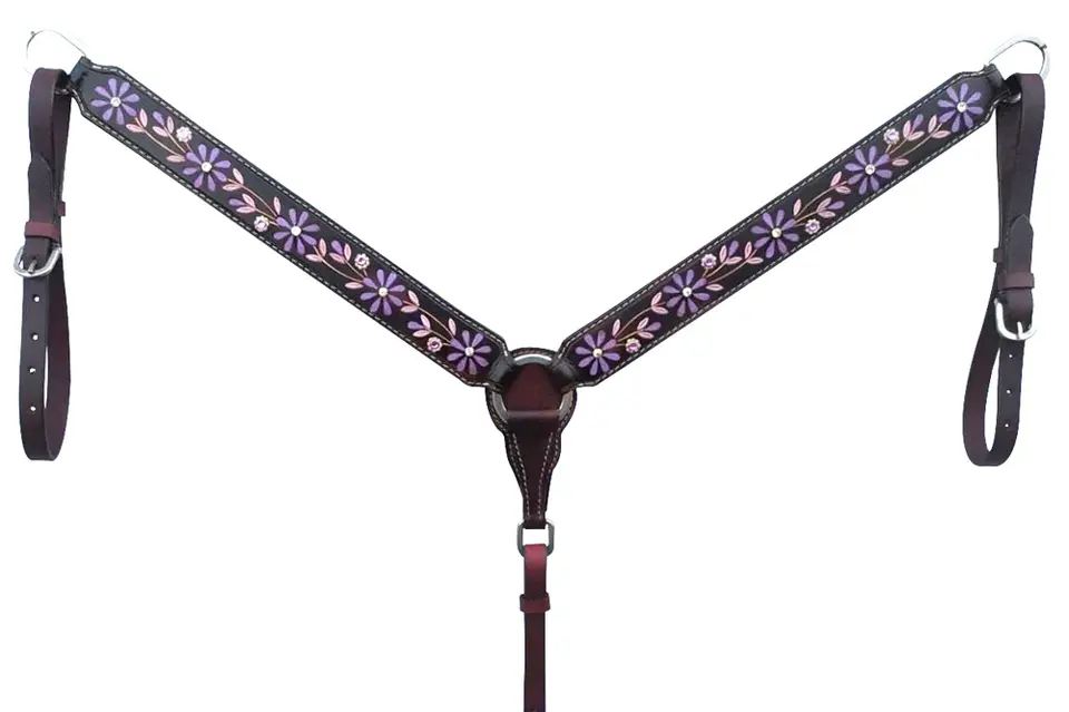 ชุดบังเหียนม้าหนึ่งหูแบบตะวันตกคอปกหน้าอกแกะสลักด้วยมือหนังลายดอกไม้สีชมพูและสีม่วงสวยงาม