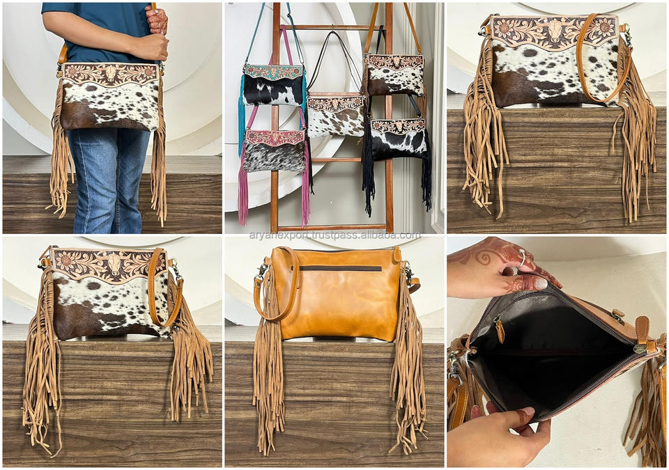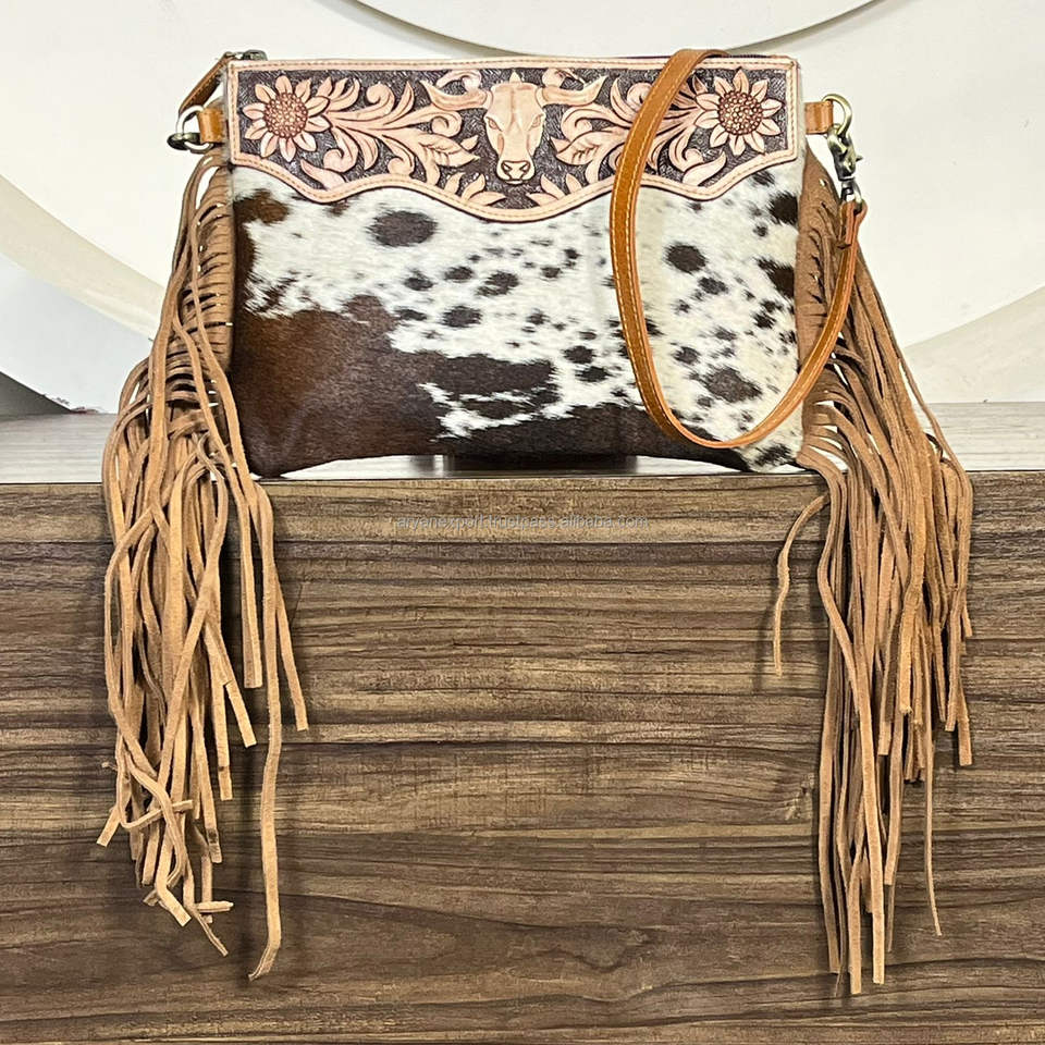 กระเป๋าหนังวัวแท้ลายตะวันตก รุ่นปี 2026 ดีไซน์เก๋ไก๋ สะพายข้าง ตกแต่งพู่หนัง พร้อมสายสะพายไหล่หนังขนสัตว์ สำหรับผู้หญิง