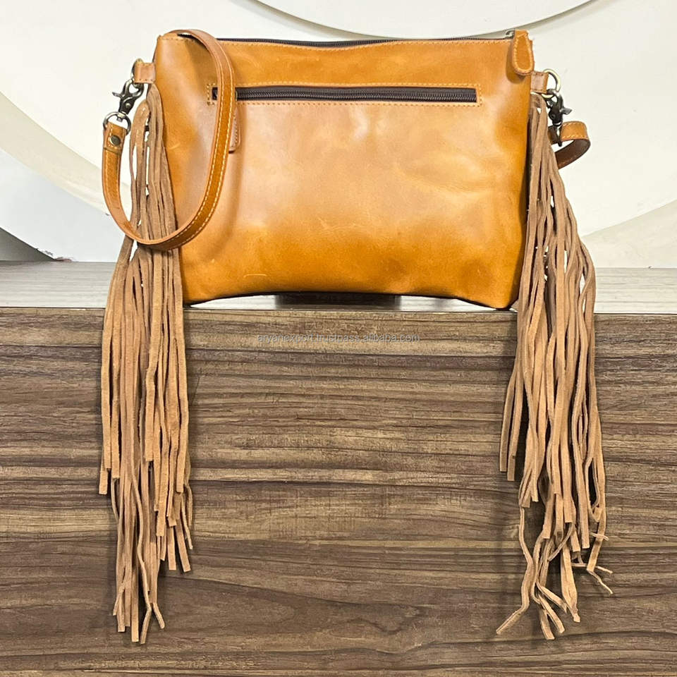 กระเป๋าสะพายข้างหนังวัวแท้ ทำมือ ประดับพู่