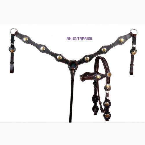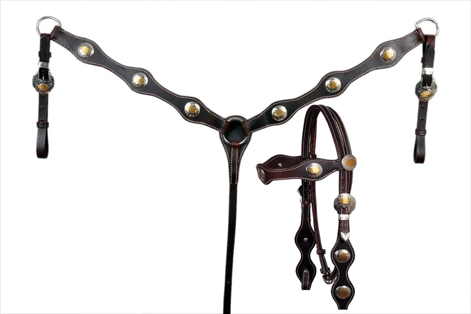 ชุดหูฟังแบบตะวันตกและปกหน้าอกพร้อมหนังแท้สีเงินสลักลายม้า