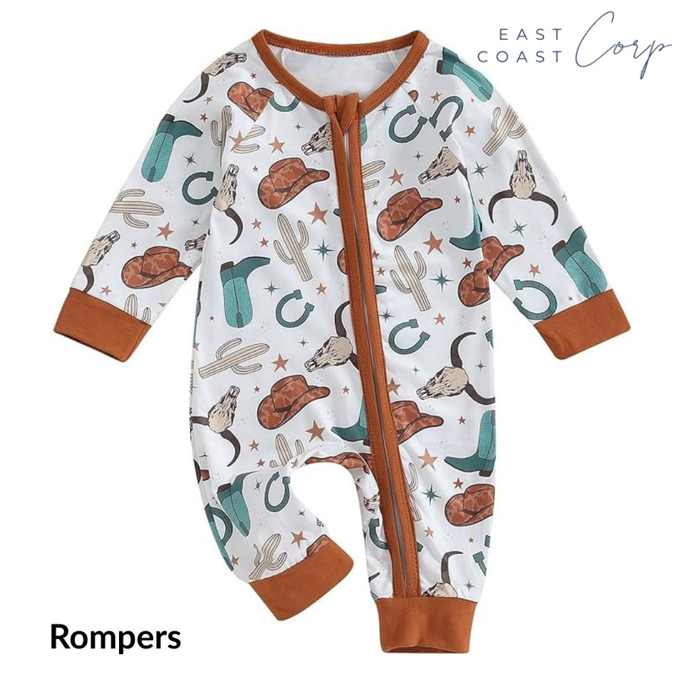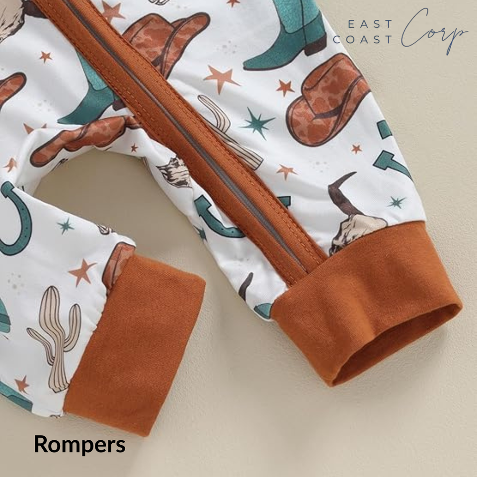 Western Style Baby Clothes | Unisex Newborn Cow Print Zip Romper