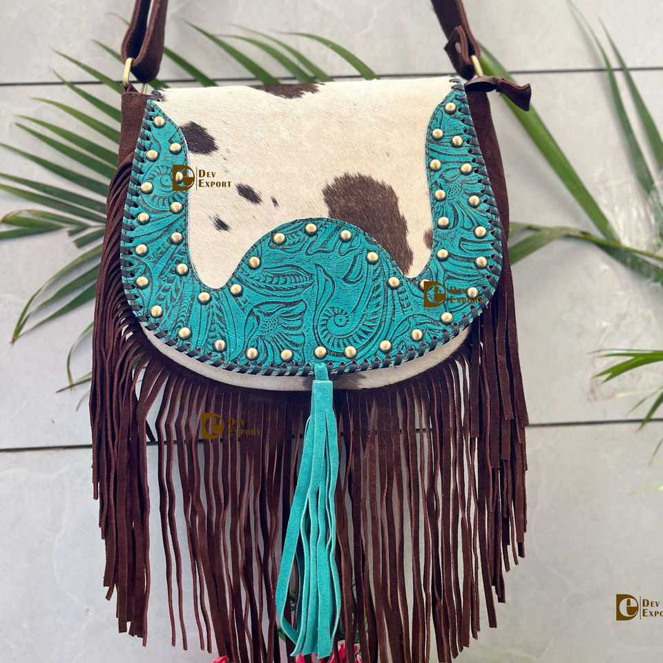 กระเป๋าถือสตรีหนังวัวสไตล์ตะวันตกกระเป๋าถือมีขอบสีเทอร์ควอยซ์แกะสลักขอบกระเป๋าแบบโบฮีเมียน