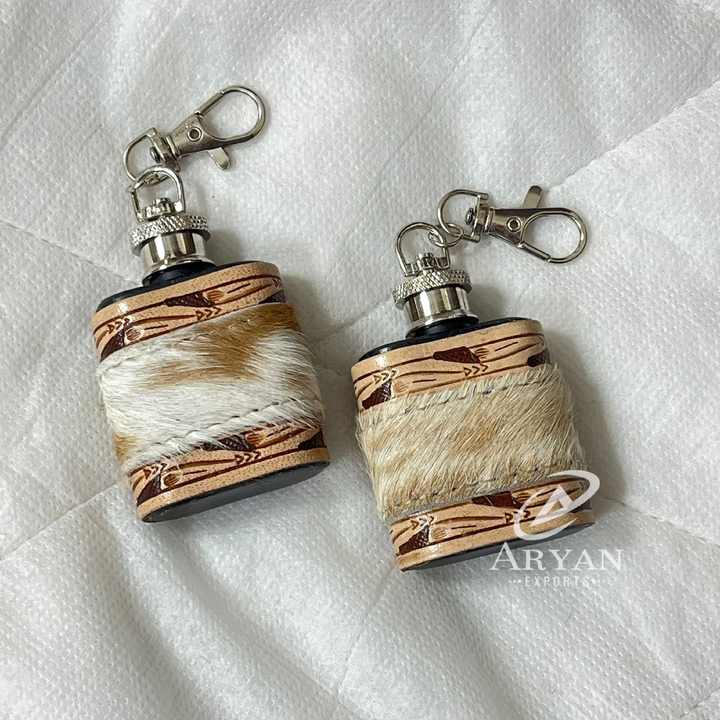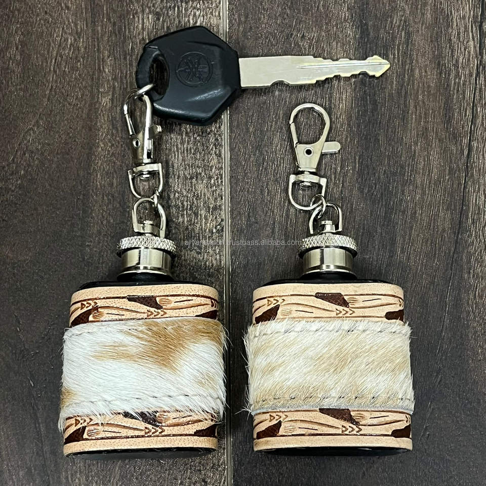 ขวดเหล้าสแตนเลสสตีลหุ้มหนังวัวแท้ทำมือ พร้อมพวงกุญแจ