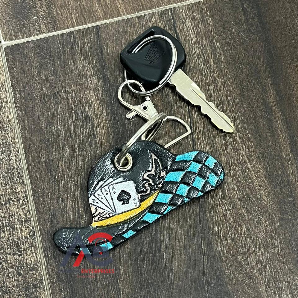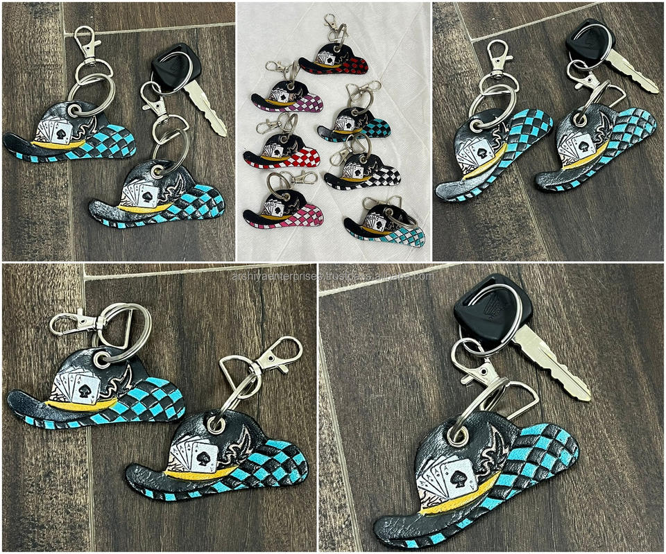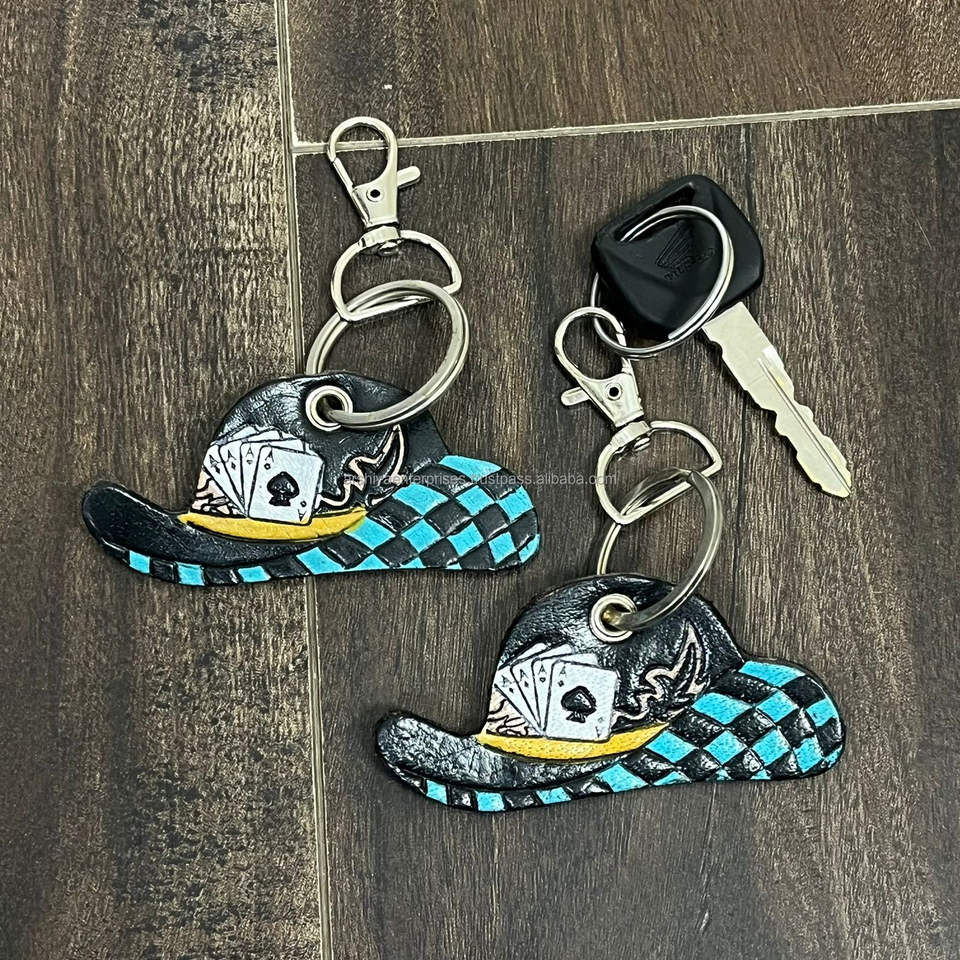 พวงกุญแจหนังวัวสไตล์ตะวันตก ลายหมากรุก รูปแบบหมวกและไพ่ ดีไซน์โรดีโอ ของที่ระลึก ของขวัญ ขายส่ง