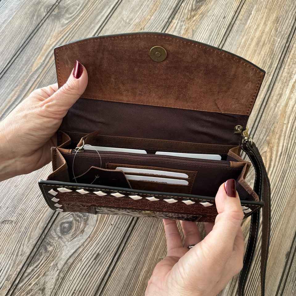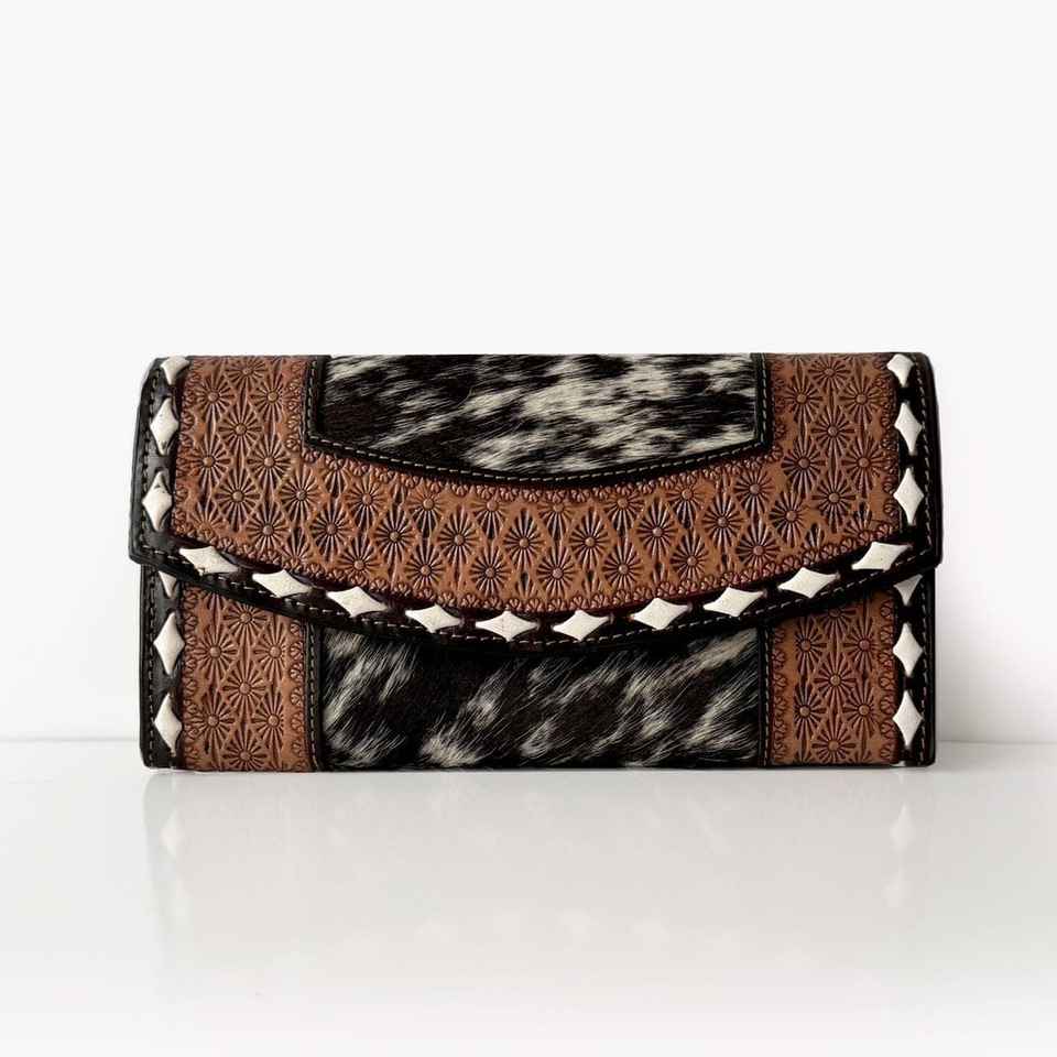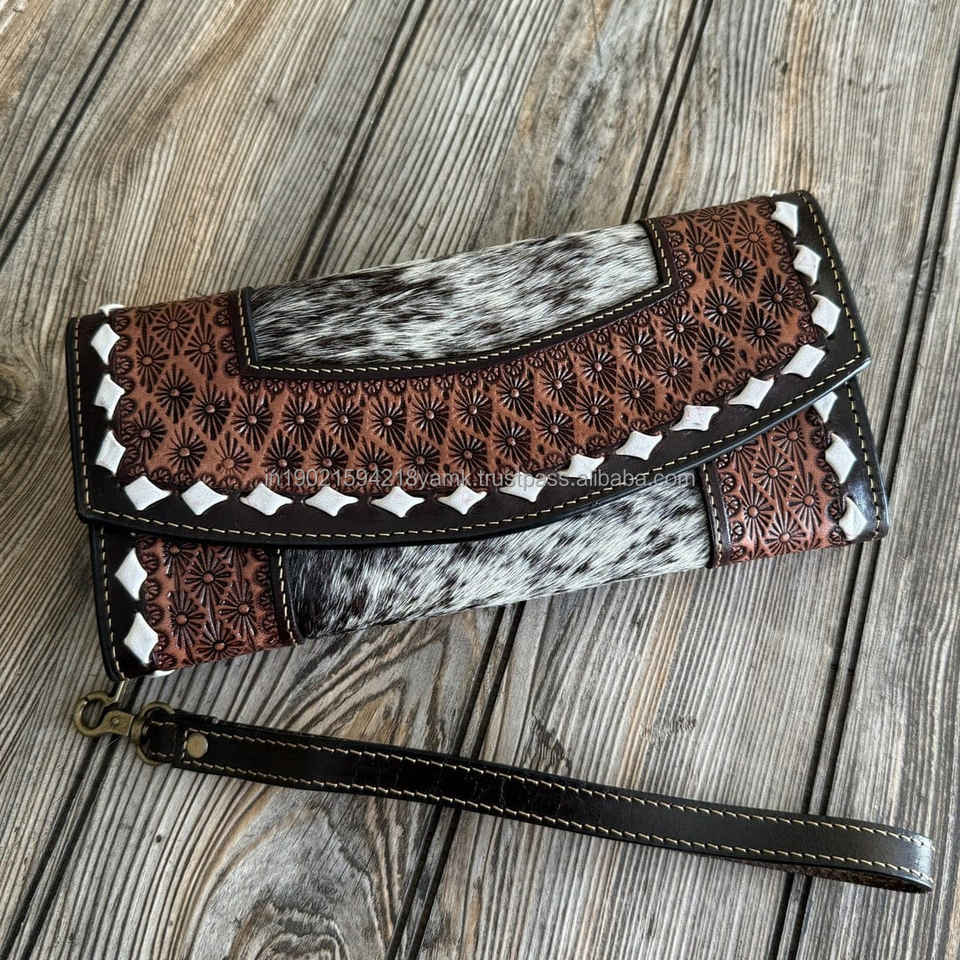 กระเป๋าสตางค์หนังวัวแท้แบบยาวพับสามตอน ดีไซน์ทรงอานม้า สไตล์ตะวันตก